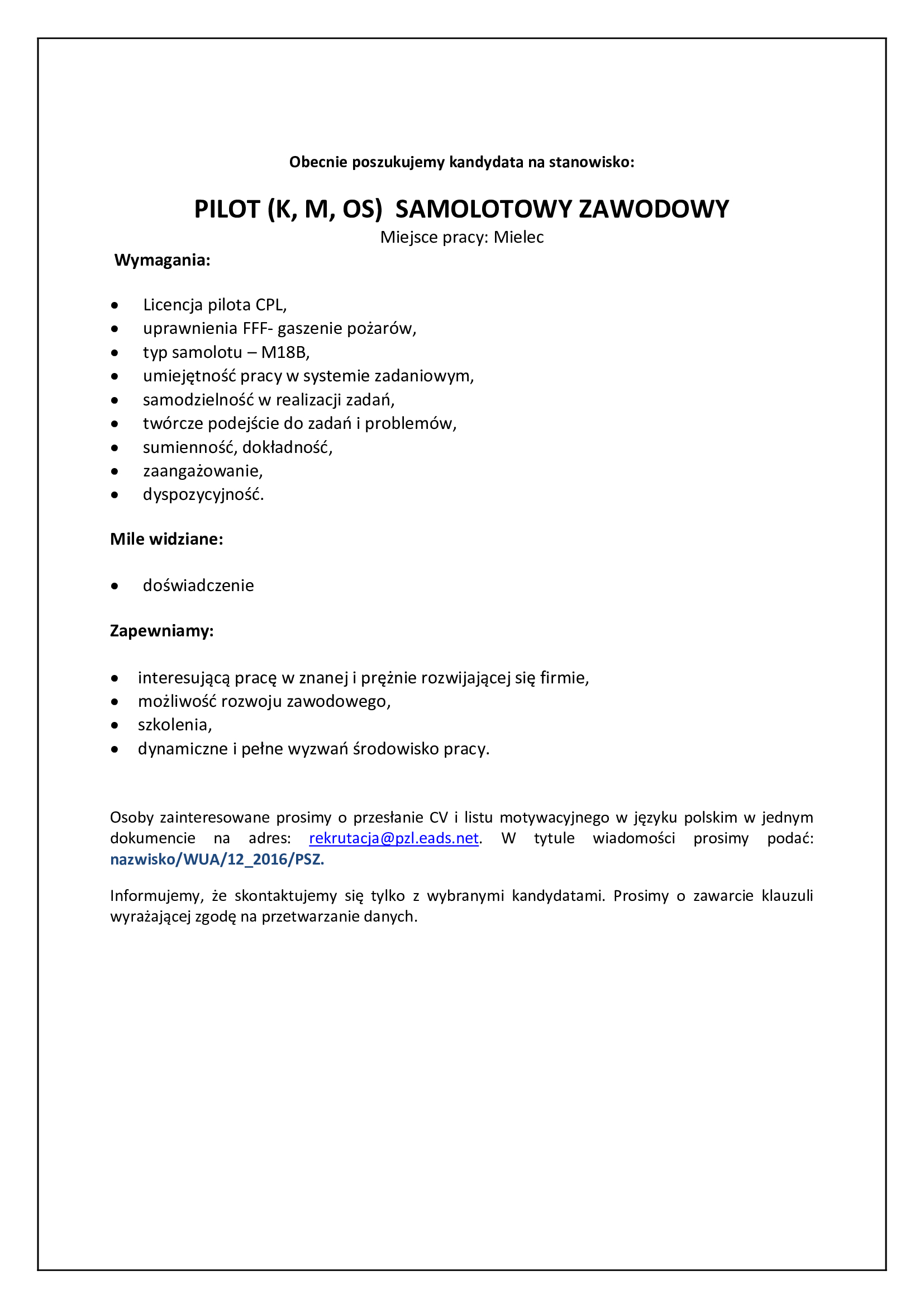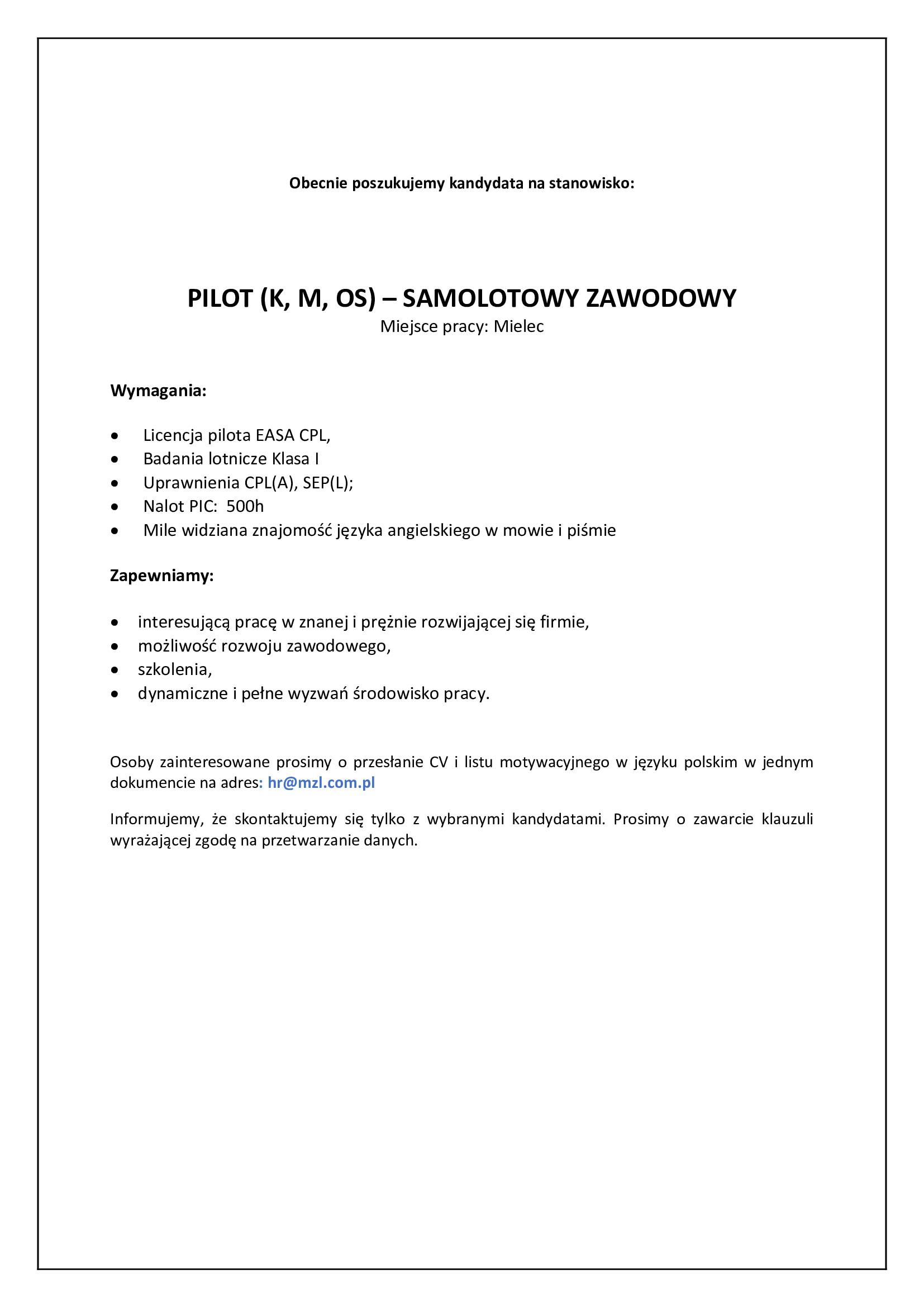 LOT Crew Sp. z o.o. działająca na zlecenie PLL LOT S.A. poszukuje pilotów statku powietrznegoNowoczesna flota, wyjątkowa atmosfera i stabilny grafik – zapraszamy na pokład Polskich Linii Lot...