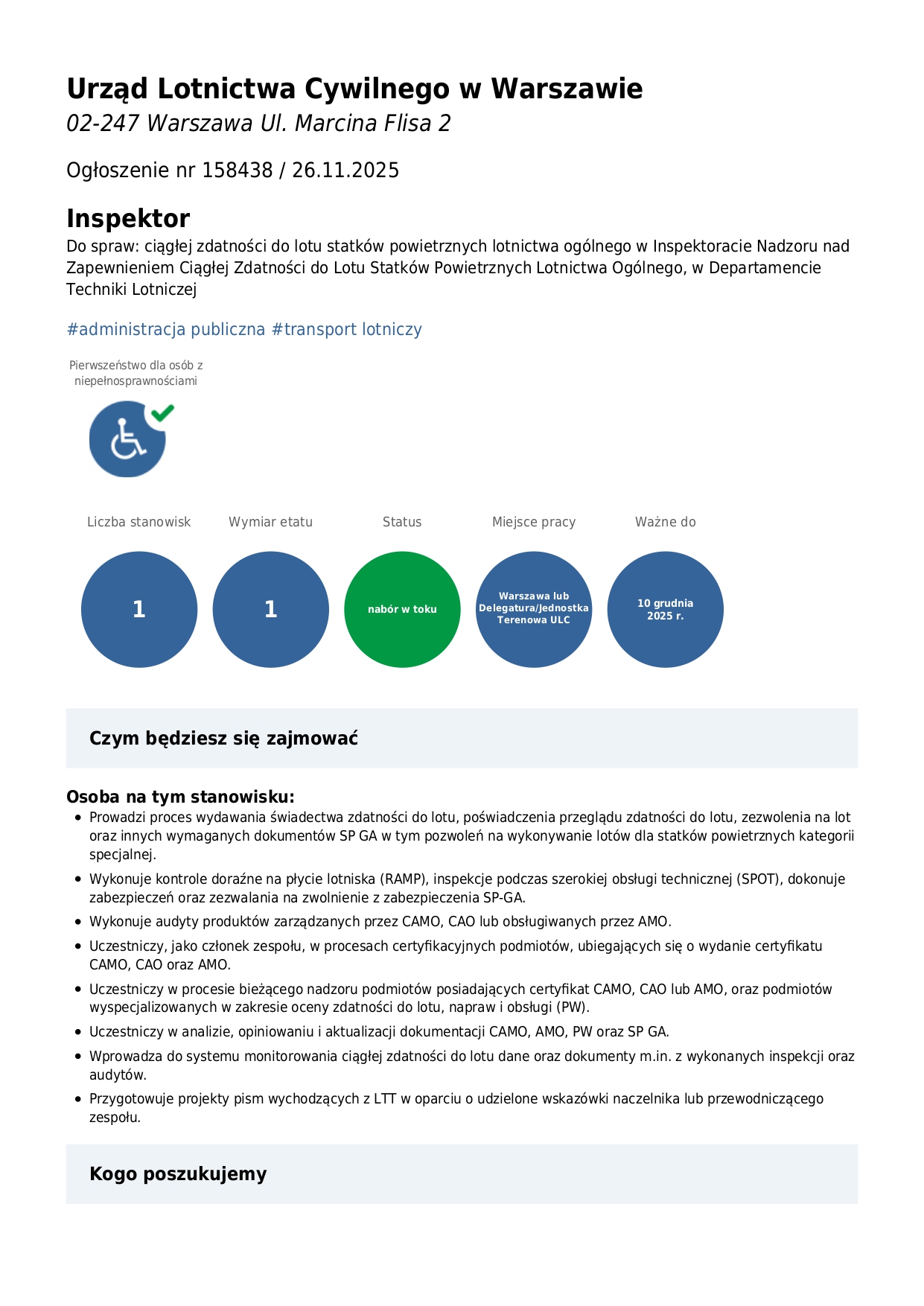 Inspektor ds. ciągłej zdatności do lotu statków powietrznych GA w ULC - Warszawa