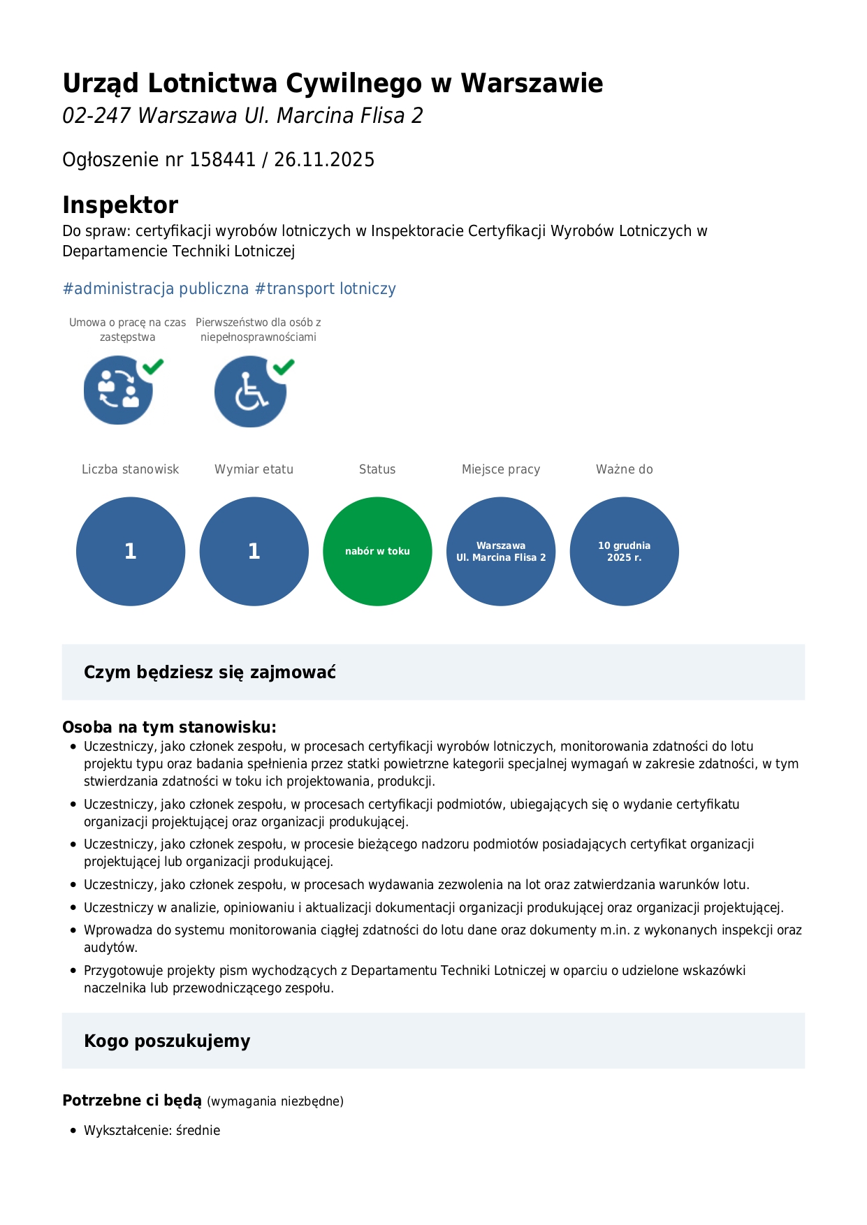 Inspektor ds. ciągłej zdatności do lotu statków powietrznych GA w ULC - Warszawa