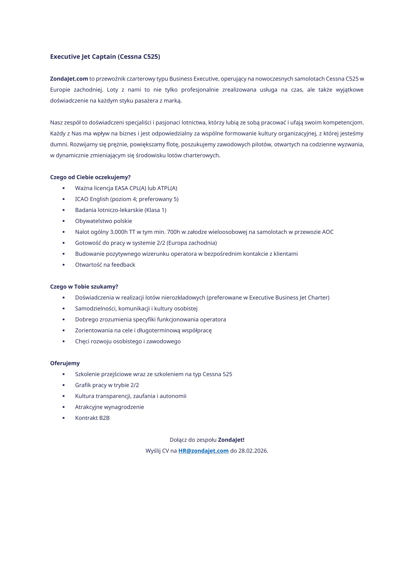 LOT Crew Sp. z o.o. działająca na zlecenie PLL LOT S.A. poszukuje Kapitana Statku Powietrznego B737Nowoczesna flota, wyjątkowa atmosfera i stabilny grafik – zapraszamy na pokład Polskich Lin...