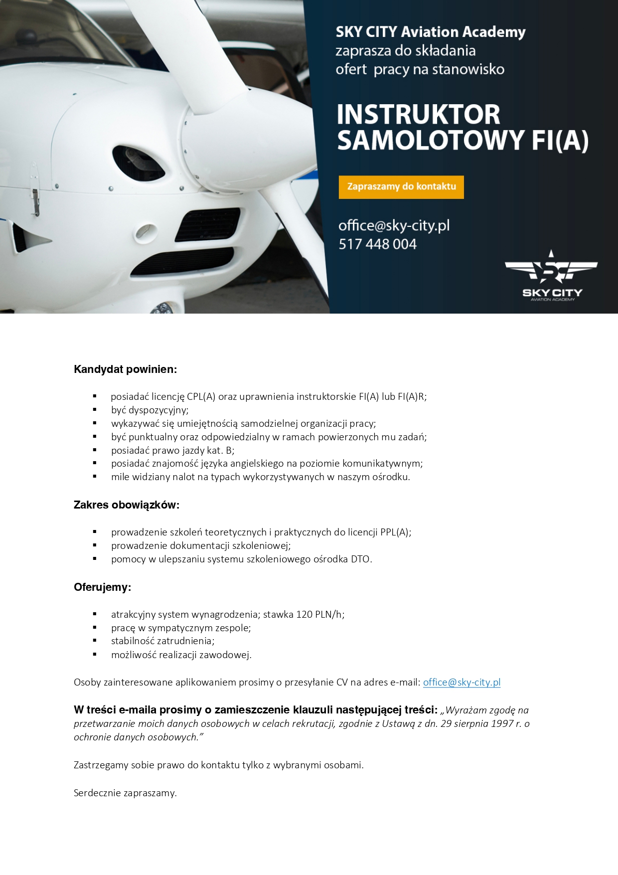Szkoła lotnicza SALT AVIATION prowadzi rekrutację na stanowisko "Instruktor FI(A)".Oczekujemy:dyspozycyjnościzaangażowania w przygotowanie lotuchęci rozwoju osobistegolicencji minimum CPL(A)...