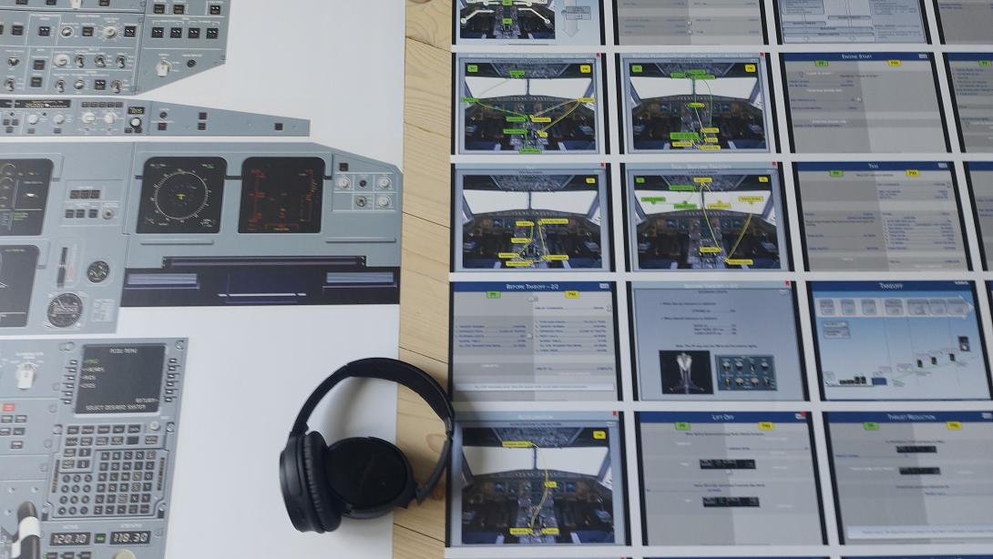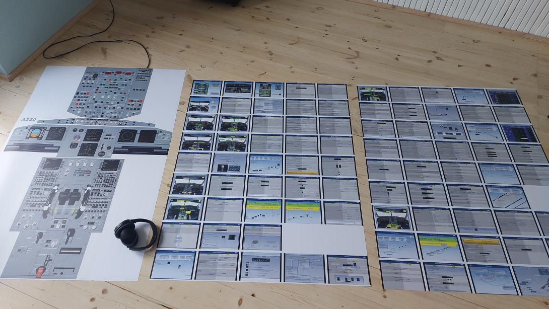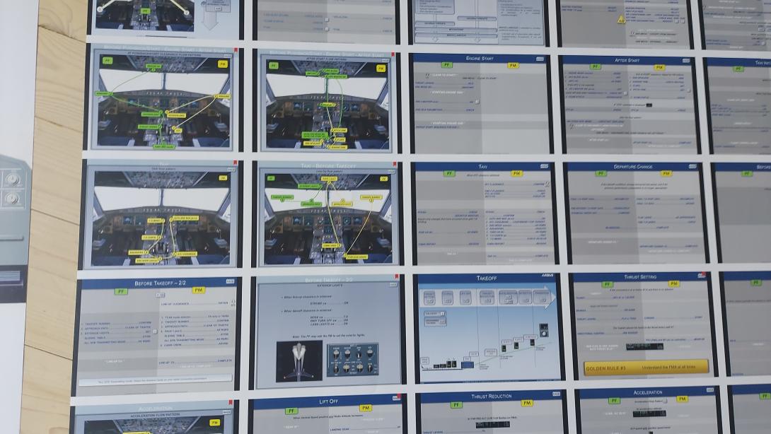 - dwa plakaty z kompletem flowów i procedur 100 x 130 cm (dwa takie same wymiary). Zawierają procedury i flowy od uruchomienia silnika po lądowanie i zabezpieczenie samolotu, Dodatkowo procedury circlingu, go around, visual approach oraz wejście w krąg z wiatrem. Są to oryginalne procedury AIRBUSA stosowane również w liniach użytkujących samoloty z rodziny A 320