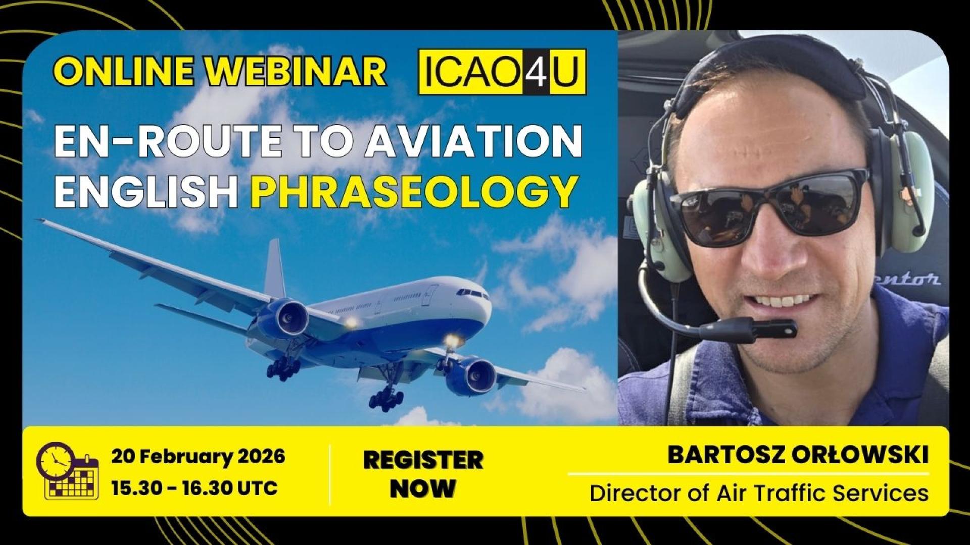 Online Webinar En-Route To Aviation English Phraseology odbędzie się 20 lutego 2026 r. w godzinach 1530-1630 UTC. Prowadzącym będzie Bartosz Orłowski, Director of Air Traffic Services. Serdecznie zapraszamy.