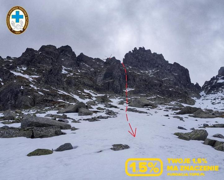 W tym czasie śmigłowiec poleciał w rejon Pościeli Jasieńskiego gdzie desantowali się dwaj ratownicy. Założyli turystom uprzęże ewakuacyjne, w których w dwóch wciągnięciach windą zostali dostarczeni na pokład będącego w zawisie śmigłowca i przetransportowani do Zakopanego. W tym czasie po uzyskaniu stosownej zgody, ratownicy znajdujący się pod Orlą Basztą przygotowali ciało zmarłego do transportu. Nadleciał ponownie śmigłowiec, którym przetransportowano ciało do Zakopanego. Okazało się że śmierć poniósł 21 letni turysta, który nie mając raków, poślizgnął się na twardych zlodzonych śniegach.