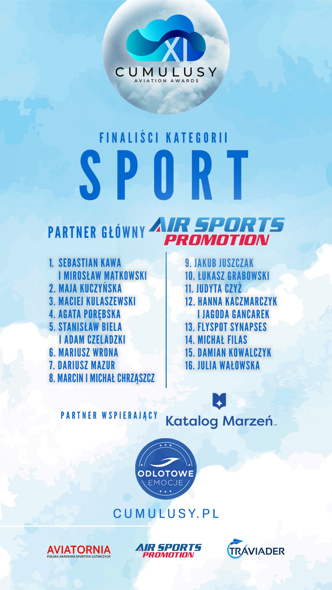 Prestiżowe statuetki – Cumulusy – trafiają do mistrzów w takich dyscyplinach sportów lotniczych jak akrobacja lotnicza, baloniarstwo, lotniarstwo, paralotniarstwo, motoparalotniarstwo, spadochroniarstwo, mikroloty, modelarstwo lotnicze, drony, szybownictwo, latanie śmigłowcowe, a także do pilotów samolotowych, którzy rywalizują w lataniu precyzyjnym, lataniu rajdowym i "air navigation race".