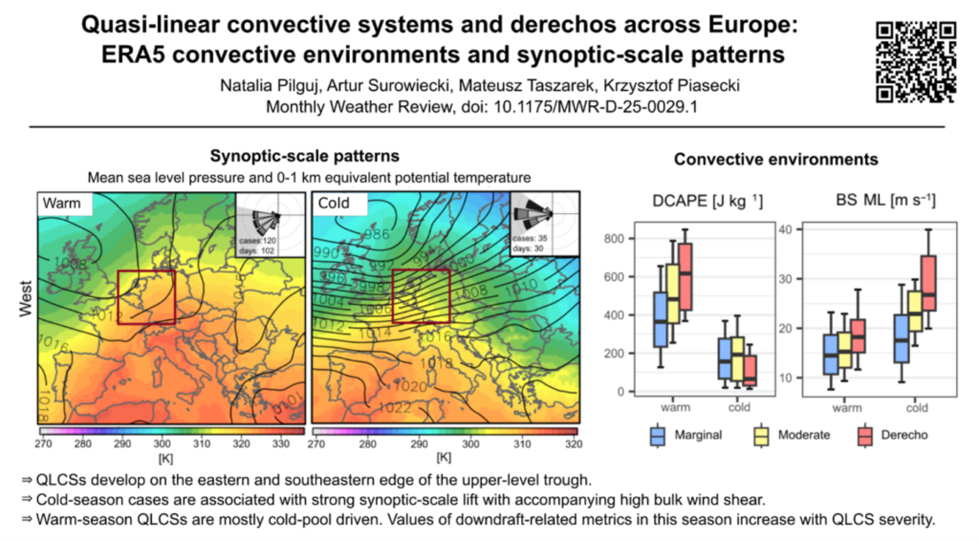 W najnowszym wydaniu czasopisma Monthly Weather Review (140 pkt MNiSW) ukazała się publikacja pt. „Quasi-linear convective systems and derechos across Europe: ERA5 convective environments and synoptic-scale patterns” autorstwa Natalii Pilguj (IMGW-PIB CMOK-LMM), Artura Surowieckiego (IMGW-PIB CMOK-LMM), Mateusza Taszarka (UAM) i Krzysztofa Piaseckiego (IMGW-PIB MOLC-CBPL).