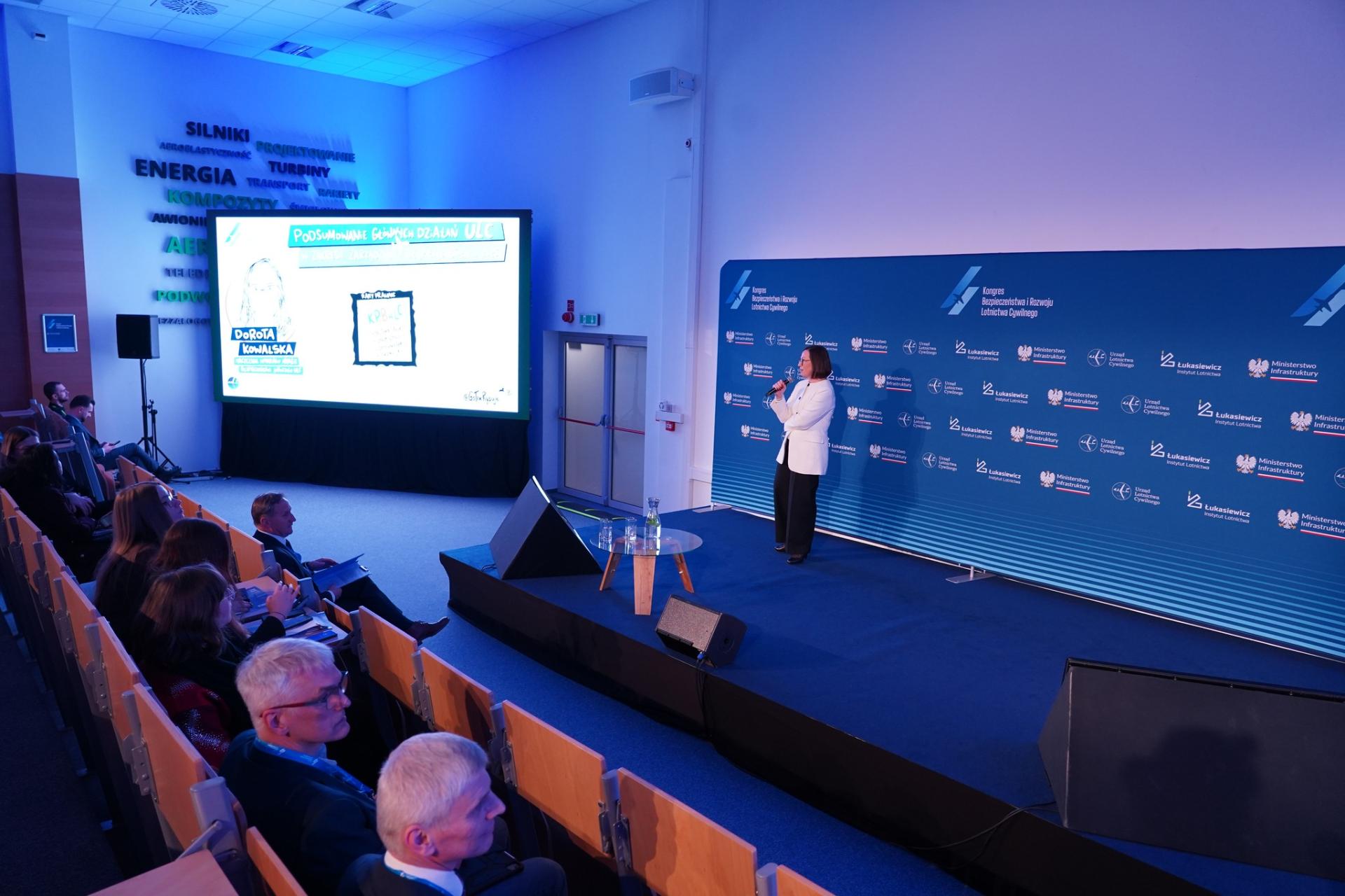 Kolejną część programu wypełniły wystąpienia prelegentów dotyczące m.in. wyzwań cyberbezpieczeństwa w lotnictwie oraz w obszarach współpracujących, zagadnienia asymetrii w stosowaniu środków sankcyjnych w lotnictwie cywilnym, w tym prawnych konsekwencji zakazu przelotów nad Rosją dla unijnych przewoźników, a także bezpieczeństwa operacji lotnictwa cywilnego w strefach podwyższonego ryzyka. Omówiono także aspekty prawne współpracy cywilno-wojskowej oraz zarządzania przestrzenią powietrzną. Podczas wykładów nie zabrakło omówienia wybranych problemów dotyczących badania wypadków w lotnictwie cywilnym wraz z najważniejszymi wnioskami. Ostatnia prelekcja pierwszego dnia obejmowała prezentację sketchnote’u podsumowującego główne działania Urzędu Lotnictwa Cywilnego w zakresie zrządzania bezpieczeństwem w 2025 r.