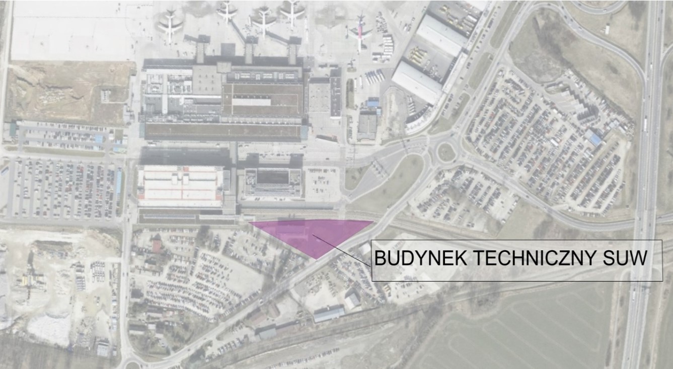 Budynek techniczny – stacja uzdatniania wody wraz ze zbiornikami wody pitnej, wyposażony będzie w nowoczesne rozwiązania technologiczne (w tym panele fotowoltaiczne) i dostosowany do ciągle rosnących potrzeb obejmujących obsługę zwiększającego się ruchu pasażerskiego. Poza funkcją uzdatniania wody, będzie w nim również realizowany proces czasowego magazynowania oraz zmiękczania wody dostarczanej do obiektów lotniska.