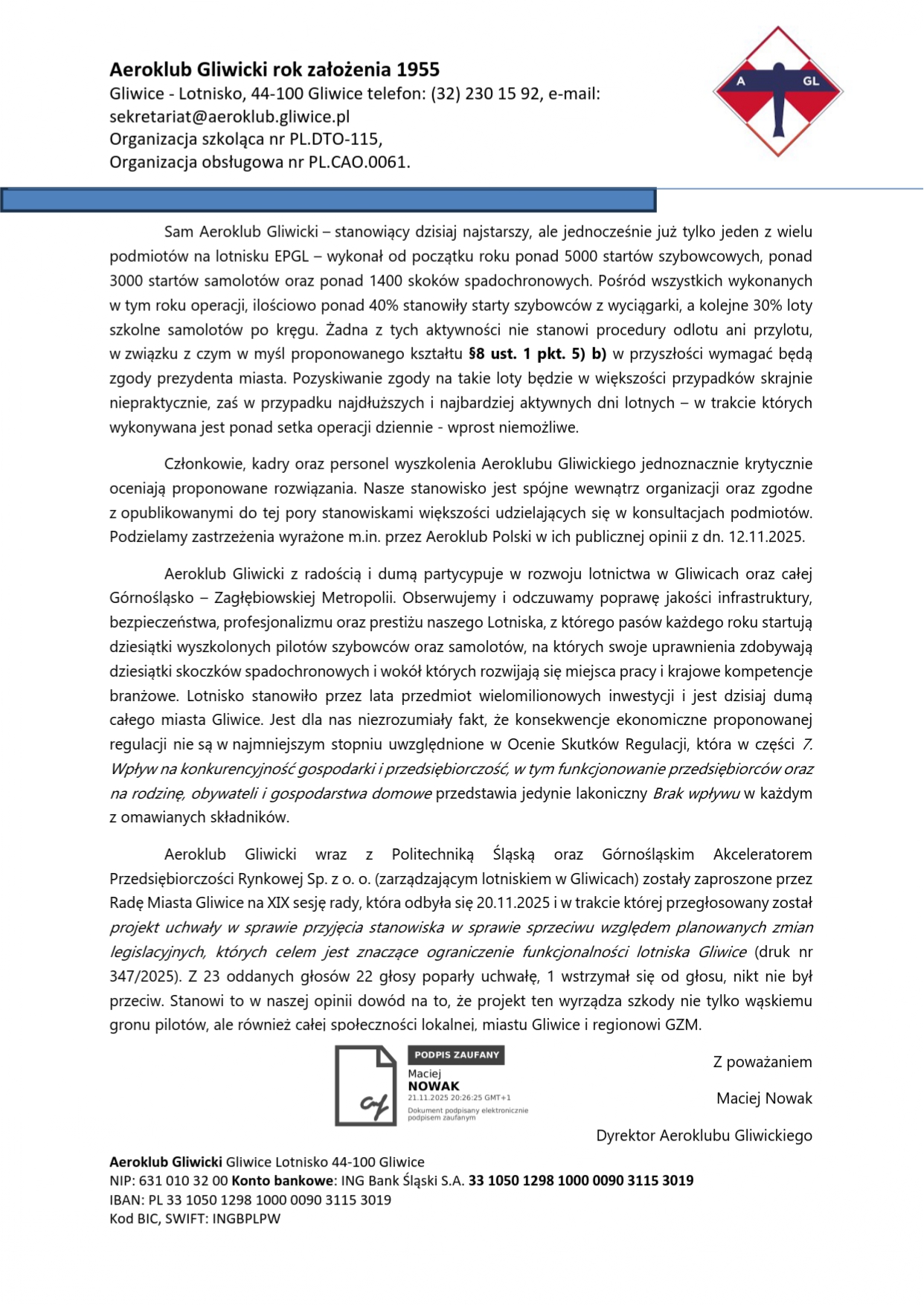 Maciej Nowak, Dyrektor Aeroklubu Gliwickiego wystosował pismo do Prezesa Urzędu Lotnictwa Cywilnego, Juliana Rottera. Opinia nawiązuje do projektu rozporządzenia Ministra Infrastruktury w sprawie zakazów lub ograniczeń lotów na czas dłuższy niż 3 miesiące.