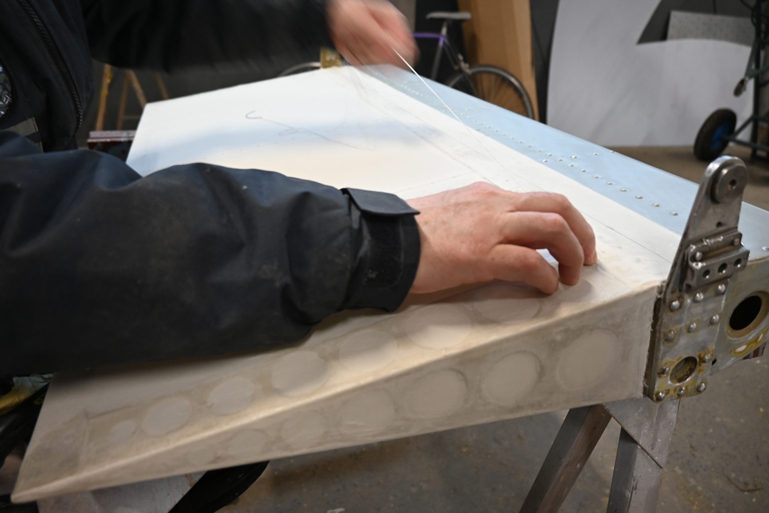 Następnie przeprowadzono usunięcie starej powłoki lakierniczej ze wszystkich części konstrukcji oraz demontaż zniszczonego pokrycia płóciennego powierzchni sterowych. Równolegle wykonano naprawy uszkodzonych elementów kratownicy płatowca, które po oczyszczeniu zostały ponownie zabezpieczone i pomalowane.