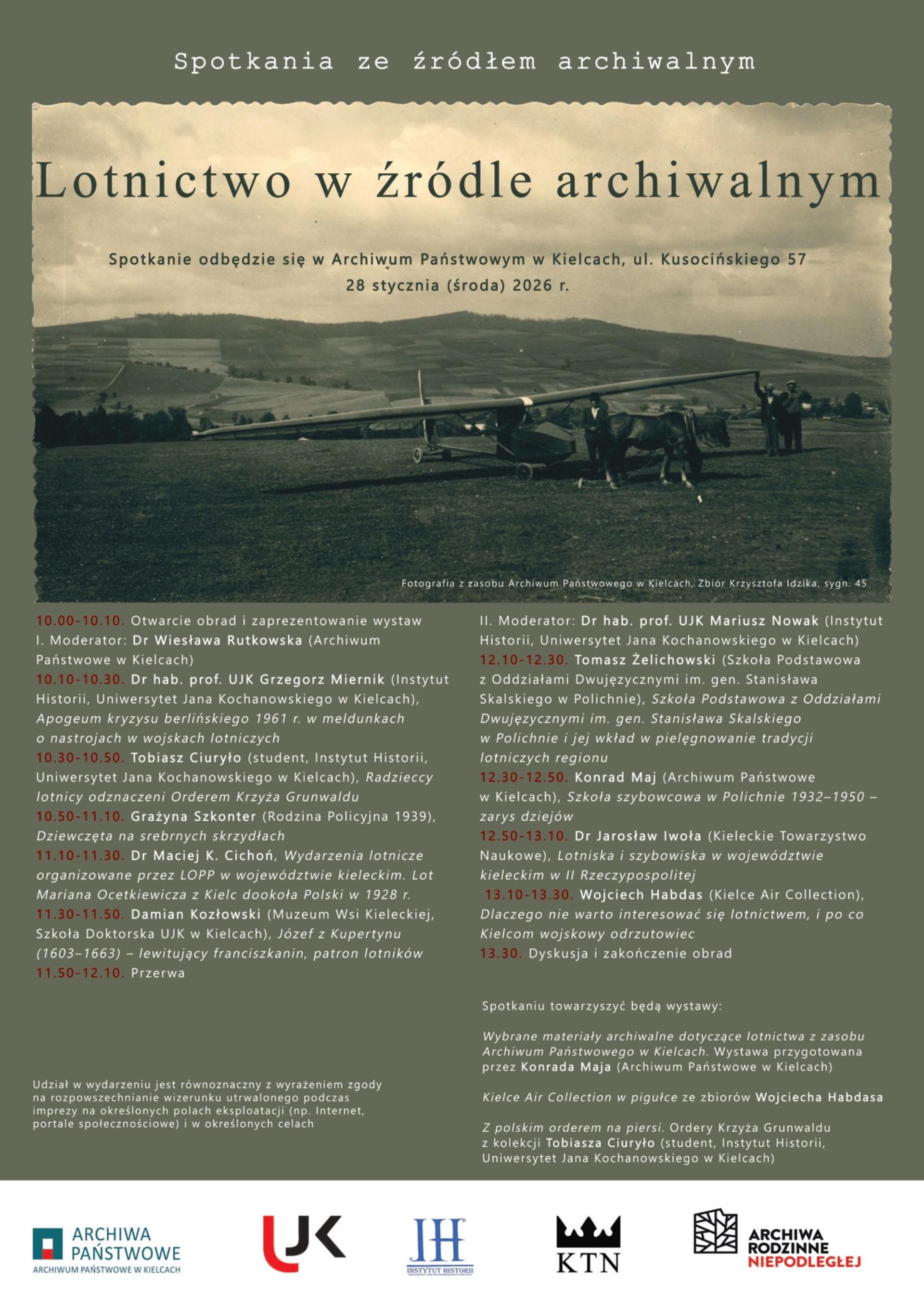 28 stycznia 2026 r. (środa) w siedzibie Archiwum Państwowego w Kielcach, ul. J. Kusocińskiego 57, odbędzie się pierwsze w tym roku „Spotkanie ze źródłem archiwalnym”, którego tematem będzie: Lotnictwo w źródle archiwalnym.