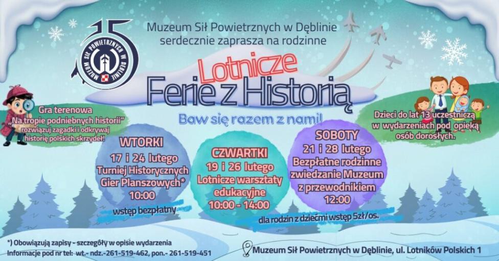 Wydarzenie skierowane jest do dzieci, młodzieży oraz dorosłych, którzy chcą spędzić czas w inspirujący i wartościowy sposób. „Lotnicze ferie z historią” to propozycja aktywnego zwiedzania muzeum, poznawania dziedzictwa polskiego lotnictwa wojskowego oraz wspólnego, międzypokoleniowego przeżywania historii w nowoczesnej i przystępnej formie.