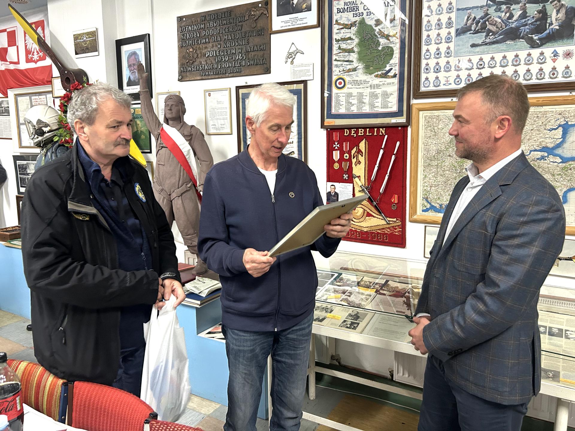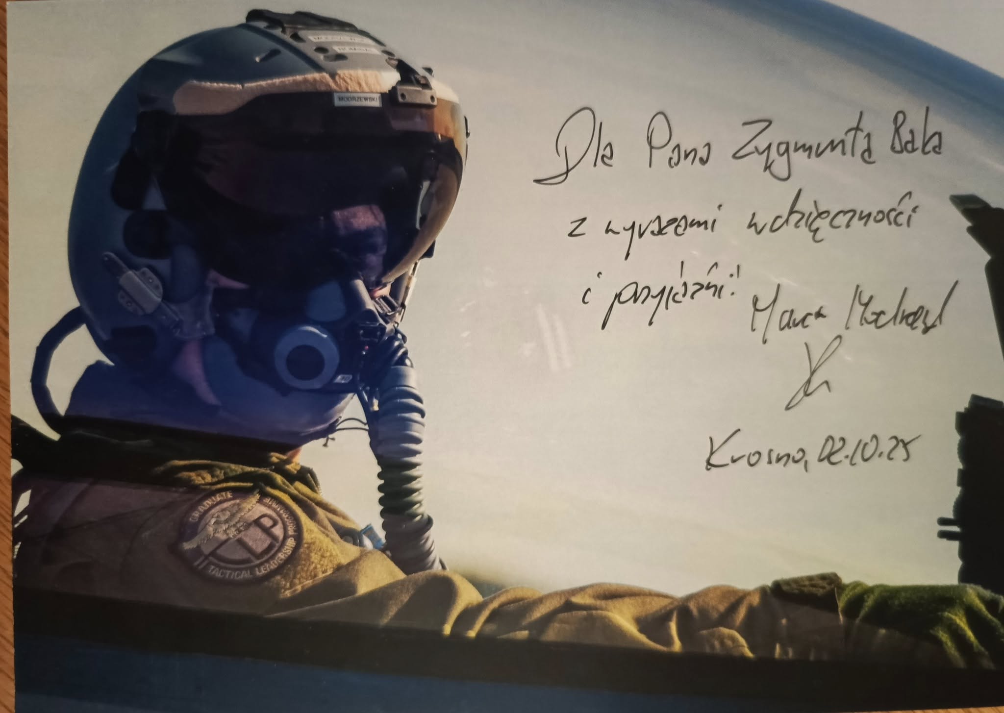 Na zakończenie, sekretarz KKSL w imieniu krośnieńskich seniorów lotnictwa wręczył Panu ppłk. Marcinowi Modrzewskiemu pamiątkę spotkania z dedykacją „…w dowód uznania dla Pana ppłk. rez. pilota Marcina Modrzewskiego za urzeczywistnienie z sukcesem młodzieńczych marzeń o magii latania i przynależności do elitarnego świata Fighter Pilota”.