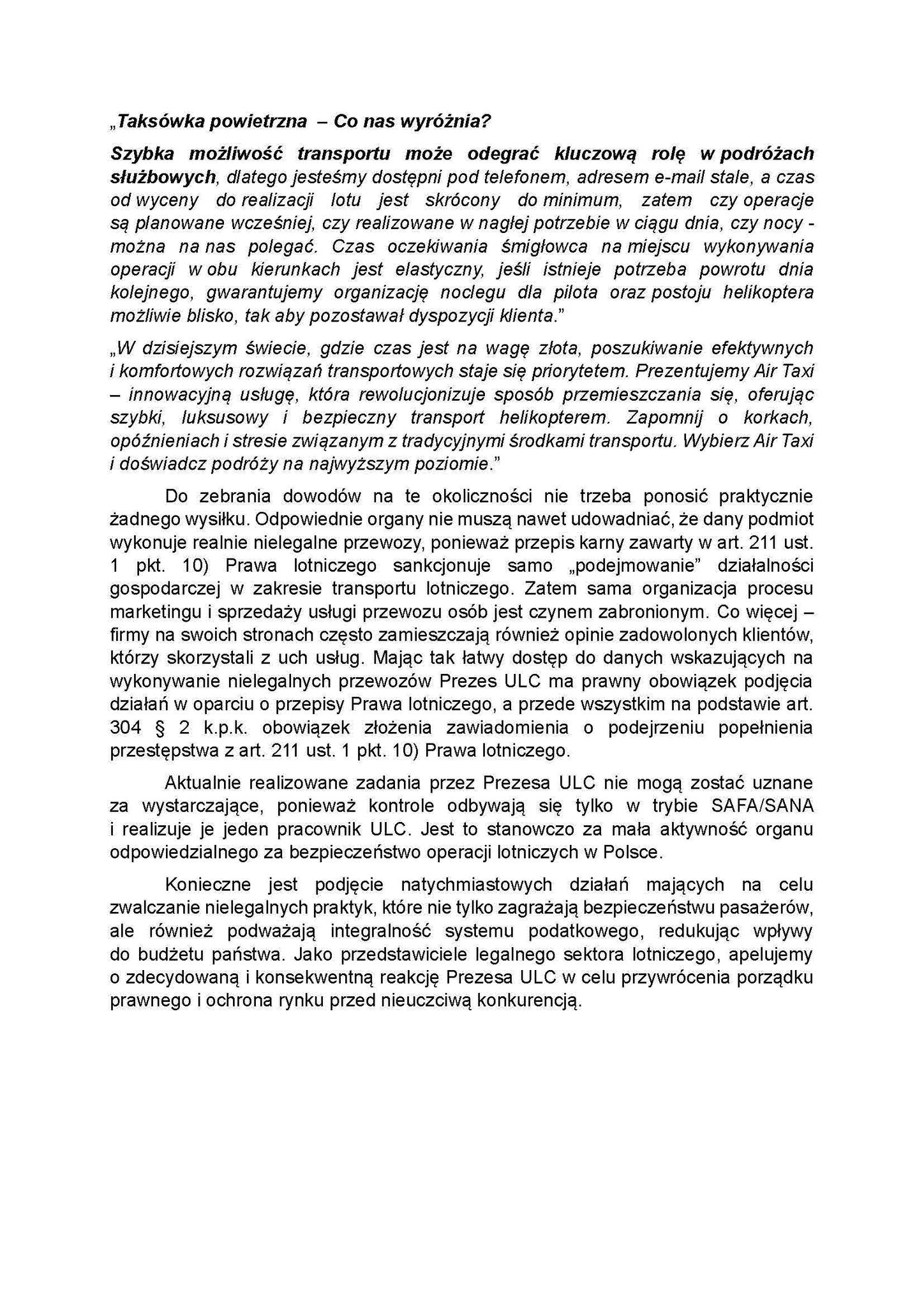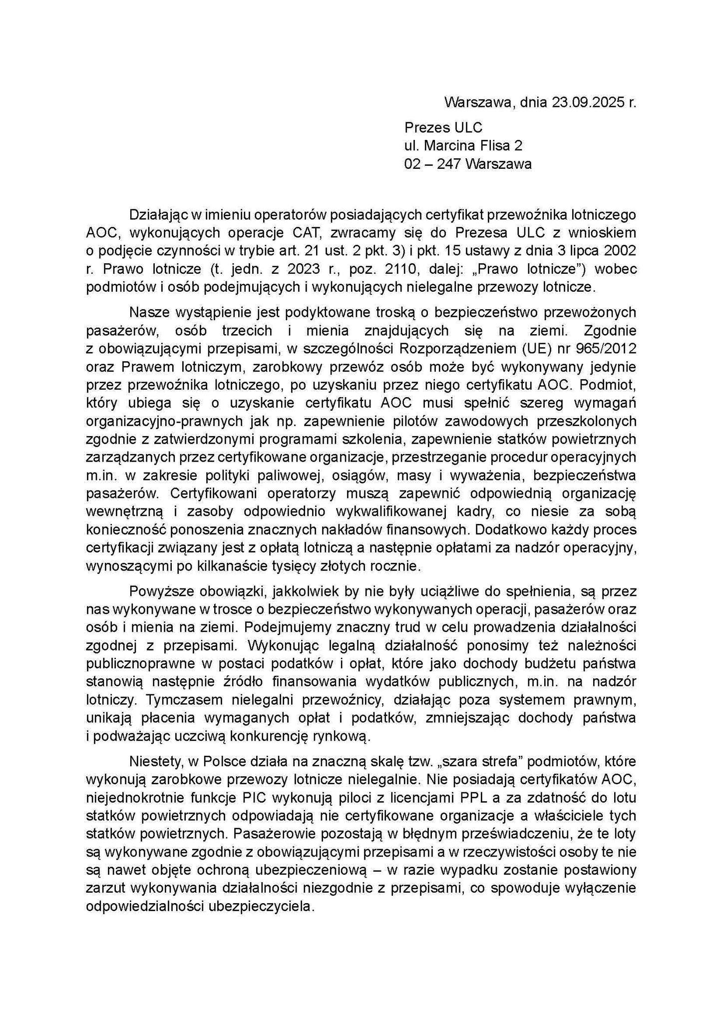 Niniejszym publikujemy list wystosowany przez operatorów posiadających AOC do Prezesa Urzędu Lotnictwa Cywilnego w kwestii podjęcia czynności wobec podmiotów i osób podejmujących i wykonujących nielegalne przewozy lotnicze.
