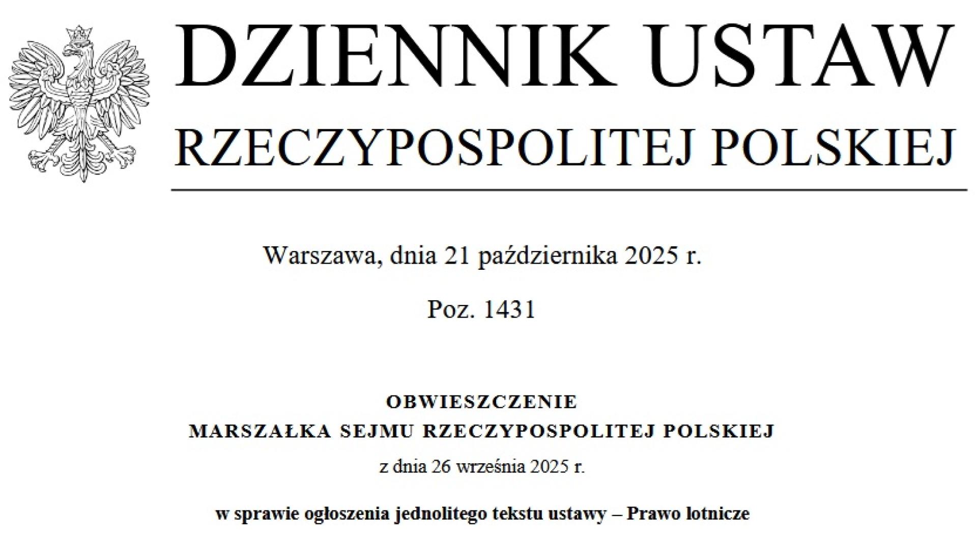 21 października 2025 r., w Dzienniku Ustaw Rzeczypospolitej Polskiej pod pozycją 1431 zostało opublikowane Obwieszczenie Marszałka Rzeczypospolitej Polskiej z dnia 26 września 2025 r. w sprawie ogłoszenia jednolitego tekstu ustawy – Prawo lotnicze.