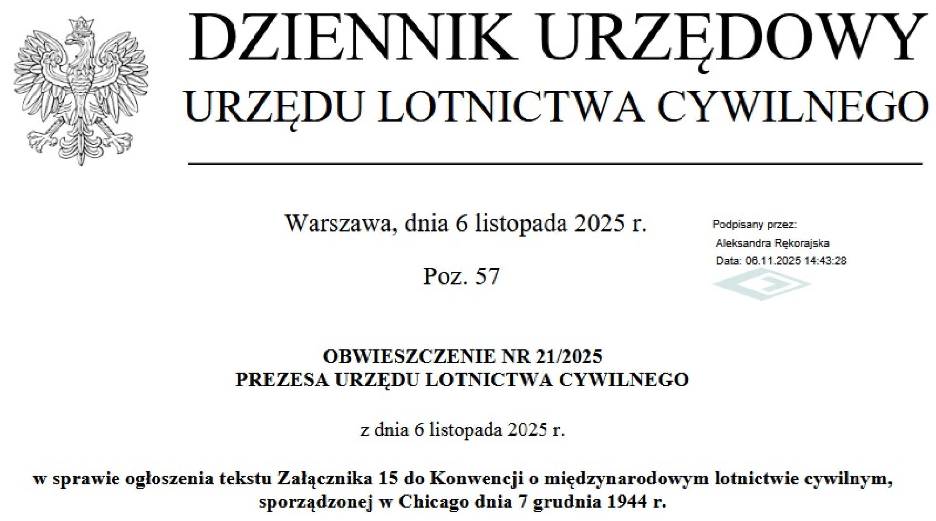 W Dzienniku Urzędowym Urzędu Lotnictwa Cywilnego zostało opublikowane Obwieszczenie nr 21/2025 Prezesa ULC z dnia 6 listopada 2025 r. w sprawie ogłoszenia tekstu Załącznika 15 do Konwencji o międzynarodowym lotnictwie cywilnym, sporządzonej w Chicago dnia 7 grudnia 1944 r.