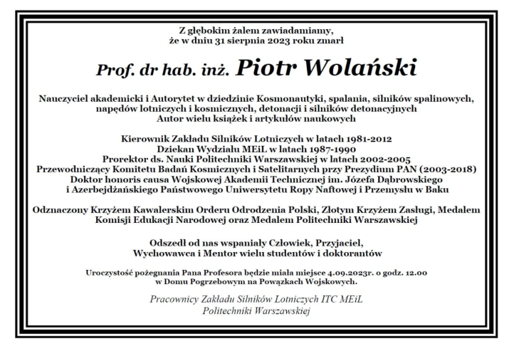 Ostatnie pożegnanie Profesora Piotra Wolańskiego odbędzie się w poniedziałek, 4 września 2023 roku o godzinie 12:00 w domu pogrzebowym na Cmentarzu Wojskowym na Powązkach.