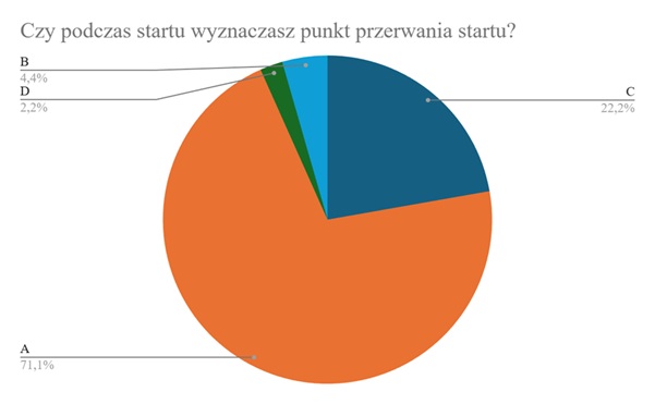 Jeśli chodzi natomiast o wyznaczenie punktu przerwania startu, to ponad 70% z Was odpowiedziało, że zawsze wyznacza taki punkt. Choć mam wrażenie, że to bardziej deklaratywne budowanie swojego dobrego nastroju, niż realna praktyka przynajmniej części respondentów. Nieco bardziej martwi mnie jednak aż 22% odpowiedzi, w której piloci deklarują prowadzenie “czujnej obserwacji”. Oczywiście lepsze to, niż nic, jednak zachęcam do zdefiniowana sobie konkretnego punktu na pasie startowym, po którego minięciu przerwanie startu nie jest już zalecane. Każda sytuacja będzie zawsze nieco inna, jednak tego typu świadomość pozwala na bardziej automatyczne podejmowanie decyzji, z większą świadomością ich ewentualnych konsekwencji.