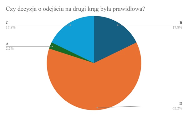 Najwięcej z Was opowiada się za opcją D, stwierdzając że decyzja została podjęta zbyt późno. Ma to sens, jeśli założymy, że pilot przed lądowaniem, albo już w jego trakcie, przewidzi wszystkie możliwe scenariusze i oszacuje ich prawdopodobieństwo. Założenie tyle prawdziwe, co idealistyczne. Po niespełna 18% głosów uzyskały natomiast dwie bardziej realistyczne odpowiedzi - B i C. Pamiętajmy, że decyzja o odejściu na drugi krąg została podjęta przez Martę z chwilą, kiedy samolot już wpadł w poślizg, a nawierzchnia po jakiej się poruszał była zanieczyszczona w sposób niejednolity.