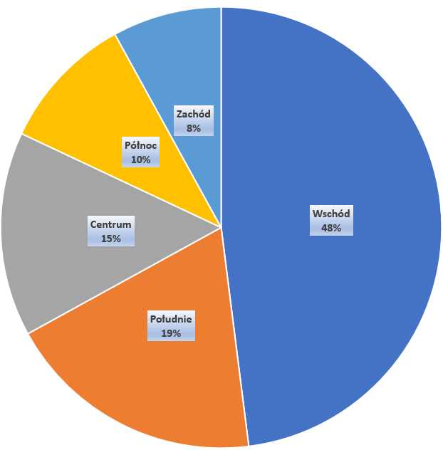 Zamieszczając e-petycję spodziewaliśmy się szczególnego odzewu wschodniej części Polski. To dla pilotów tej części krajów strefa stanowi najbardziej odczuwalne - czasami krytyczne ograniczenie. I tak jest w rzeczywistości - głosy tego obszaru przeważają - ale żadna część kraju nie pozostaje zupełnie na te ograniczenia obojętna. Poniżej wykres rozłożenia podpisów na umowne części Polski.