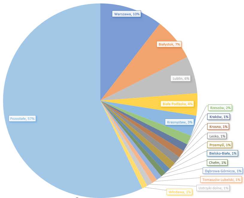 Dokładny podział na miasta, w których poparcie dla petycji było największe - jest uwarunkowany raczej wielkością populacji - ale również pokazuje, że nawet spora odległość od EPR 129 nie sprawia, że to ograniczenie nie ma dla pilotów znaczenia. Poniżej wykres miast, w których zarejestrowano największą liczbę podpisanych e-petycji.
