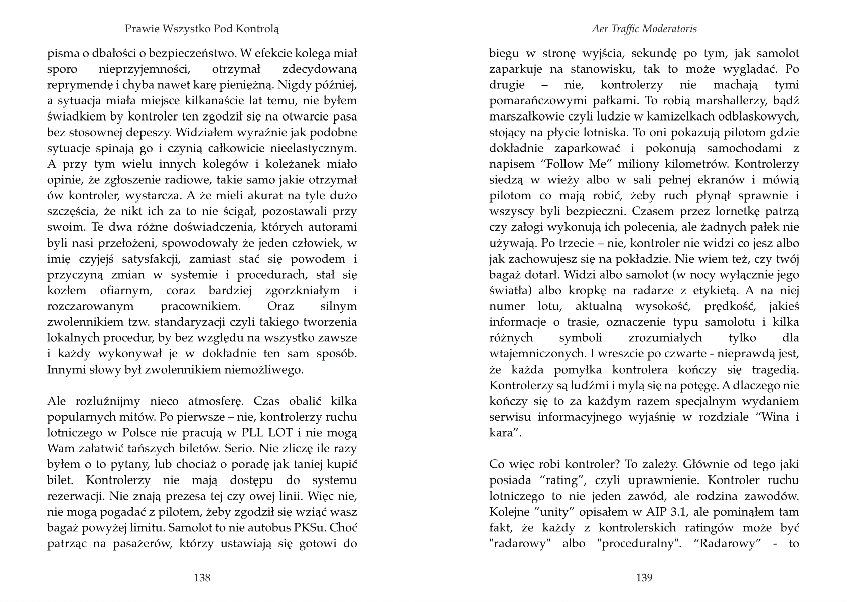 "Prawie wszystko pod kontrolą" to książka dla każdego, kto chce zobaczyć prawdziwe oblicze zawodów wysokiego ryzyka. Dzięki niej pilot zrozumie dlaczego kontroler bierze na siebie ryzyko, chcąc oszczędzić nerwów załodze w kokpicie i dlaczego czasem konieczne jest wykonanie jeszcze jednego holdingu. Pasażer, dlaczego czasem czeka w dusznym samolocie. Urzędnik administracji lotniczej – jak naprawdę wygląda praca specjalisty operacyjnego. Student lotnictwa otrzyma przewodnik, którego nie znajdzie w podręcznikach.