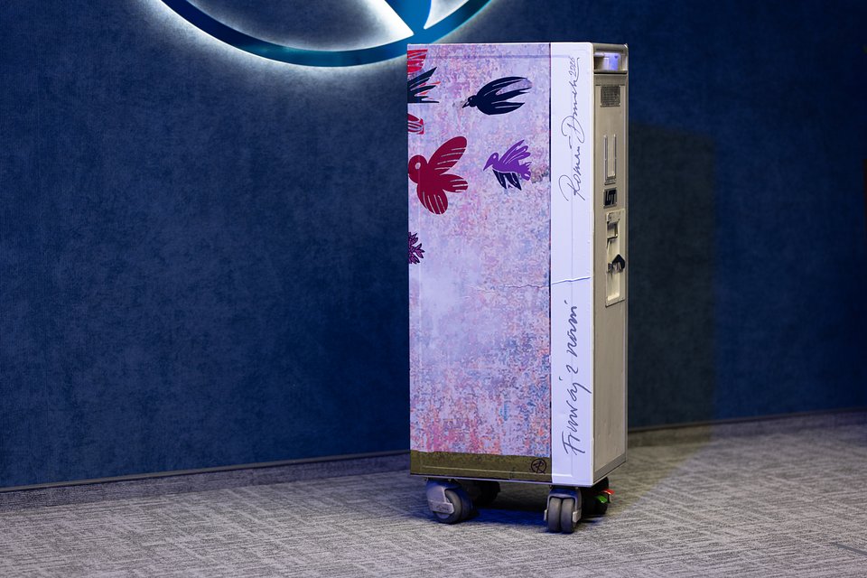 Kolejna aukcja obejmuje oryginalny wózek cateringowy, który służył na pokładach samolotów PLL LOT do serwowania napojów, posiłków oraz sprzedaży Duty Free. Dziś wraca na ziemię w zupełnie nowej roli – otrzymał drugie życie jako wyjątkowy przedmiot użytkowy, stworzony z myślą o 34. Finale Wielkiej Orkiestry Świątecznej Pomocy. Do wózka dołączona jest także odbitka grafiki „Fruwaj z nami”.