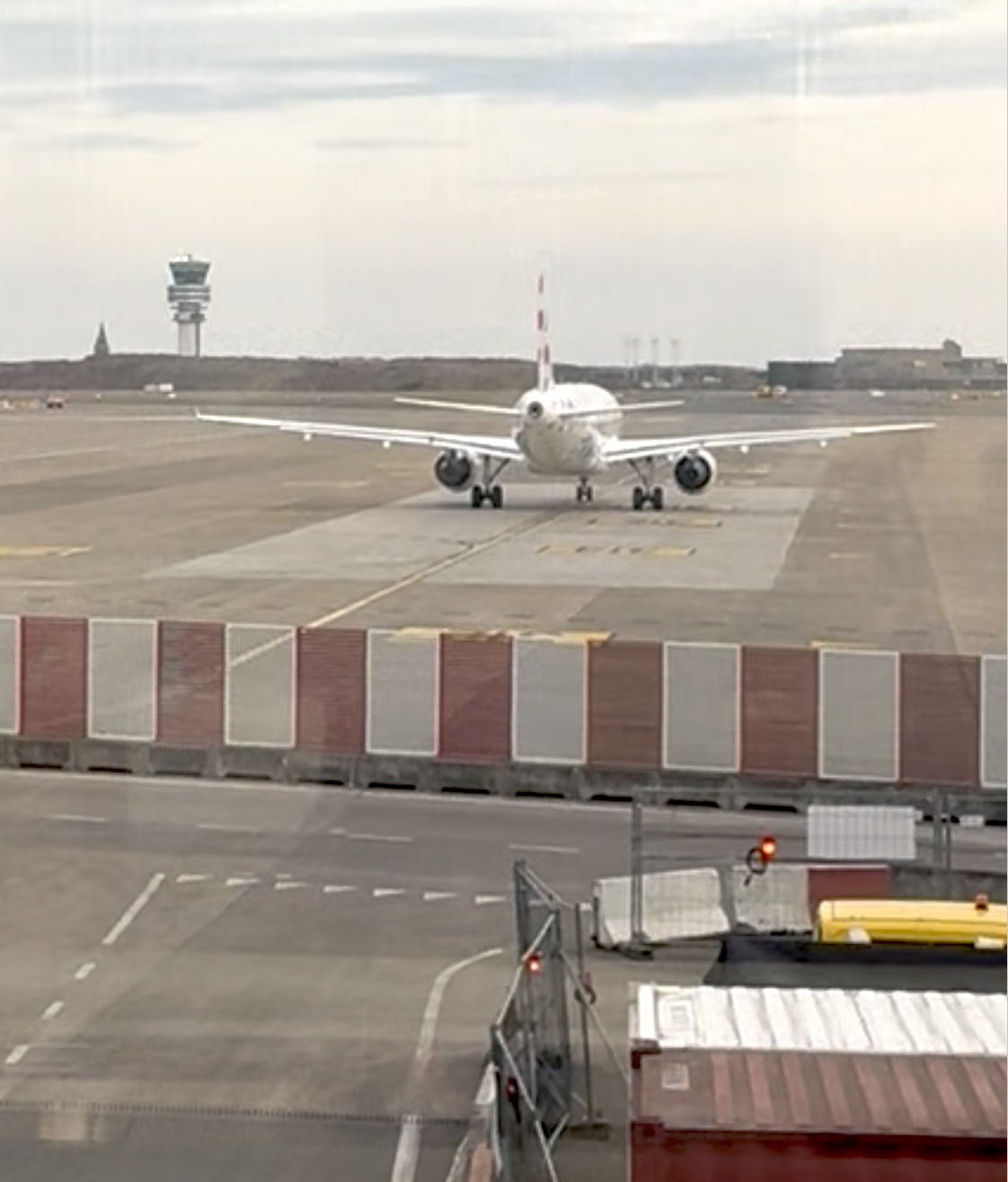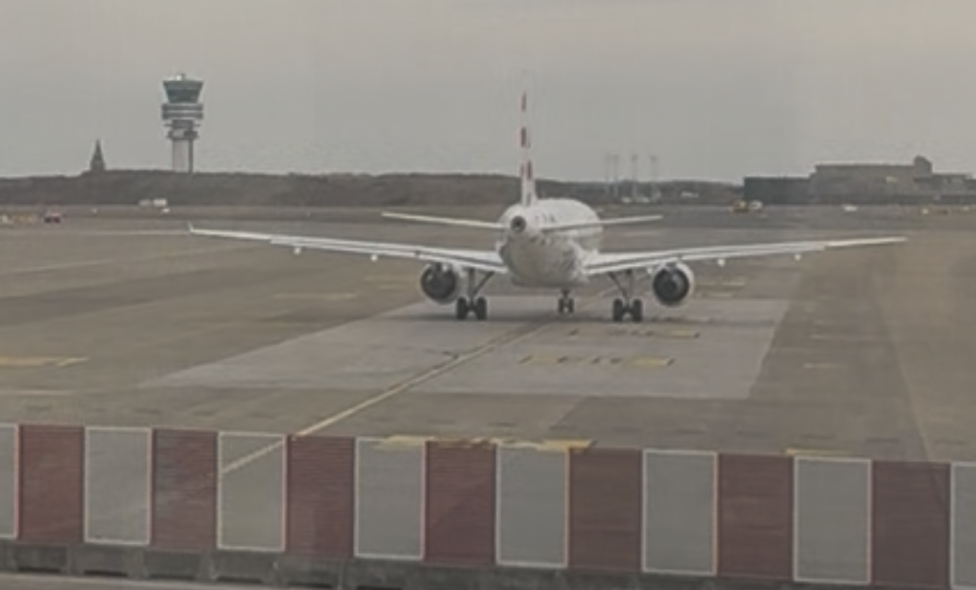To zdjęcie zostało prawdopodobnie wykonane z terminalu, ukazując infrastrukturę lotniskową. Na pierwszym planie widzimy samolot pasażerski. W tle, po lewej stronie, widoczna jest wieża, a także zabudowania lotniska po prawej stronie. Cała scena przedstawia typową infrastrukturę lotniskową z płytą postojową i drogą kołowania. Samolot już kołuje w kierunku drogi startowej.