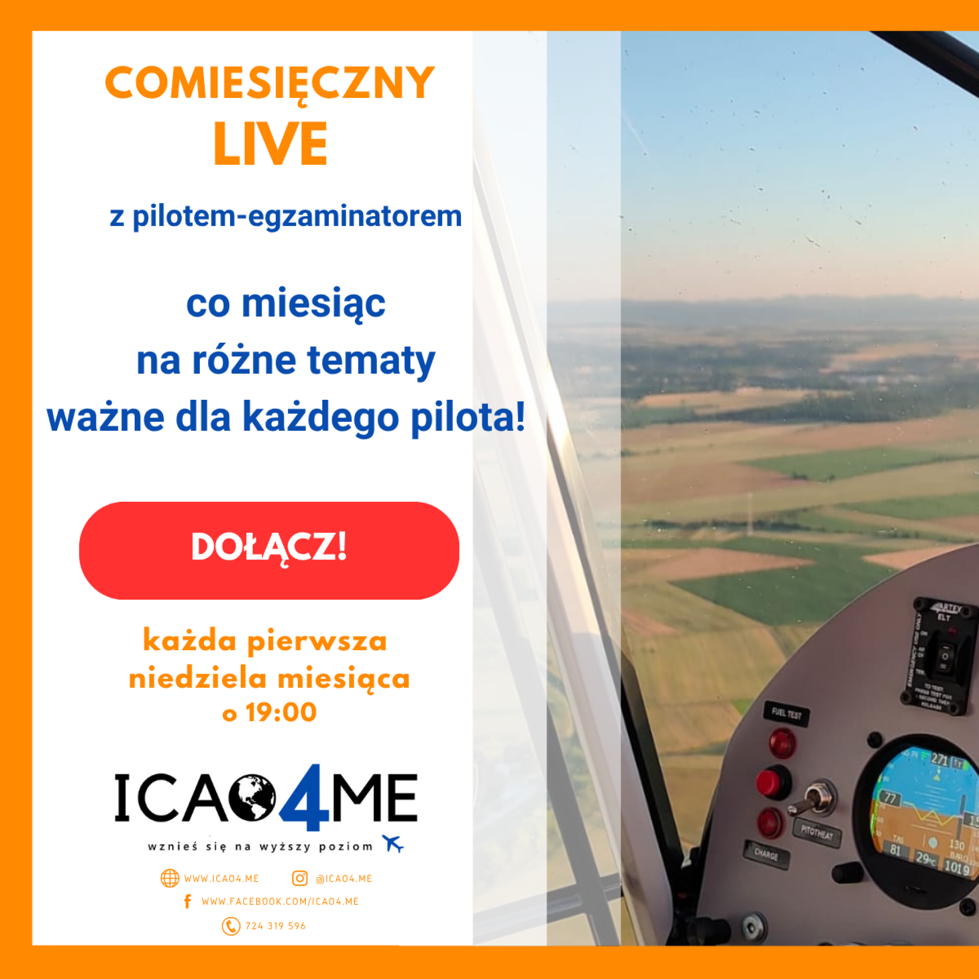 Po intensywnej serii webinarów edukacyjnych organizowanych przez ostatnie dwa lata, Polskie Centrum Lotniczego Angielskiego ICAO4.me zmienia formułę upowszechniania lotniczej wiedzy i zaprasza wszystkich obecnych i przyszłych pilotów na regularny live z pilotem-egzaminatorem, podczas którego Uczestnicy będą mogli zadać nurtujące ich pytania dotyczące uprawnienia Aviation English i nie tylko.