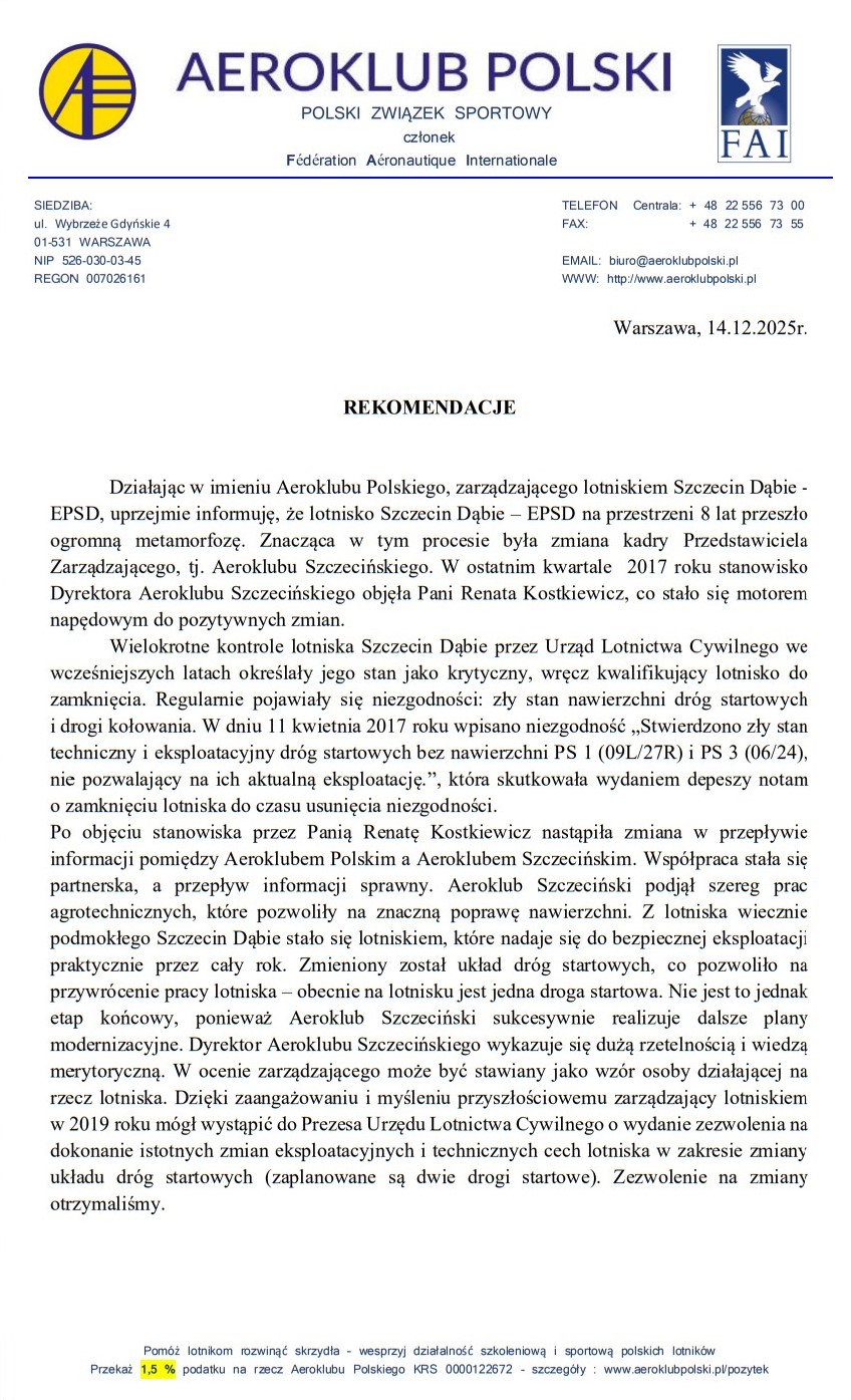 Zarząd Aeroklubu Szczecińskiego opublikował rekomendacje Aeroklubu Polskiego z dnia 14.12.2025 r. dotyczące działalności Aeroklubu Szczecińskiego oraz zarządzania lotniskiem Szczecin Dąbie (EPSD).