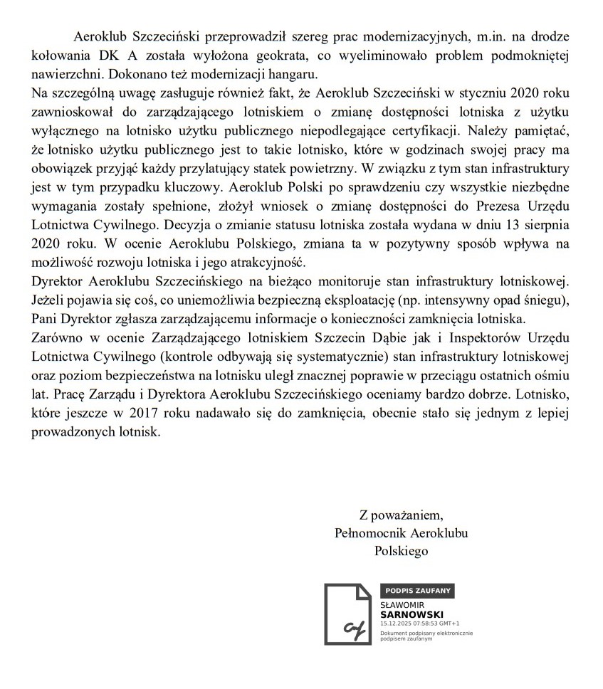 – Publikujemy ją w trosce o transparentność oraz rzetelne informowanie o faktycznym stanie i kierunku rozwoju lotniska Szczecin Dąbie – mówią członkowie Zarządu Aeroklubu Szczecińskiego.