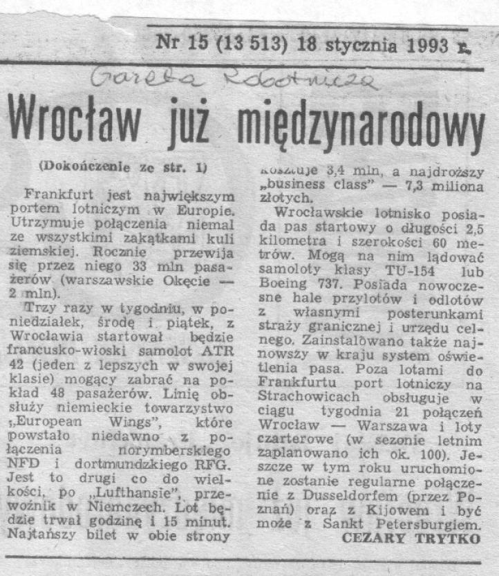 To było historyczne wydarzenie, które otworzyło Wrocław na świat. 18 stycznia 1993 roku linie Eurowings uruchomiły pierwsze międzynarodowe połączenie z Wrocławia. Pasażerowie polecieli wtedy do Frankfurtu nad Menem.
