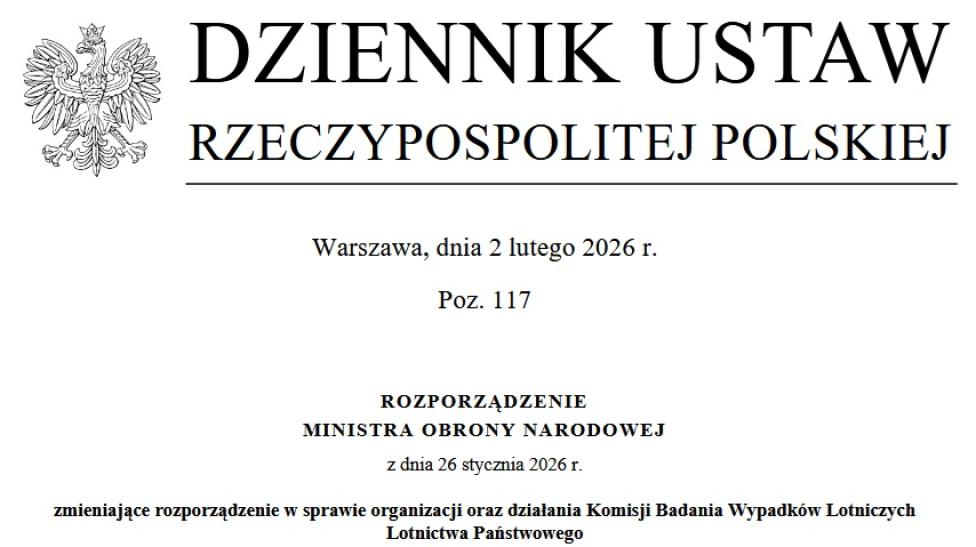 2 lutego 2026 r., w Dzienniku Ustaw Rzeczypospolitej Polskiej poz. pozycją 117 zostało opublikowane Rozporządzenie Ministra Obrony Narodowej z dnia 26 stycznia 2026 r. zmieniające rozporządzenie w sprawie organizacji oraz działania Komisji Badania Wypadków Lotniczych Lotnictwa Państwowego.