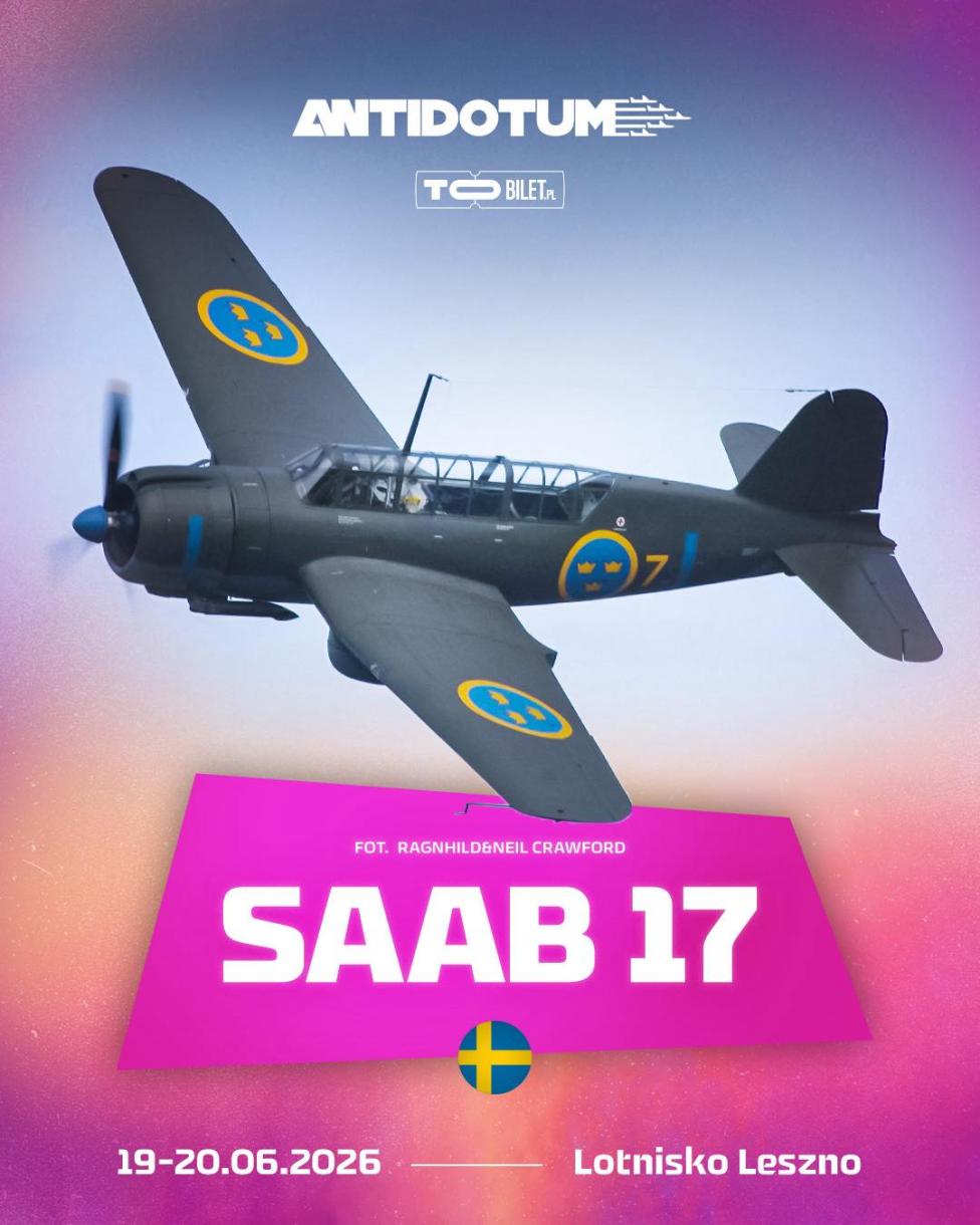– Dlatego ogłoszenie, że Saab 17 pojawi się na Antidotum Airshow Leszno 2026 to wydarzenie absolutnie wyjątkowe - po raz pierwszy w historii pokazów lotniczych w Polsce zobaczymy go w powietrzu, co jest ogromnym powodem do dumy i świetną szansą, by zobaczyć na żywo ten niezwykły kawałek historii lotnictwa. Dziękujemy Swedish Air Force Historic Flight za przyjęcie zaproszenia, a Was zachęcamy do zakupu biletów na ToBilet, bo podziwianie Saaba 17 na niebie to niezwykła rzadkość – mówią organizatorzy.