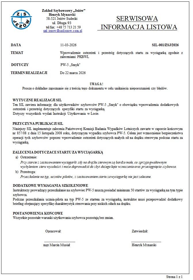 Zakład Szybowcowy "Jeżów" opublikował dwie Serwisowe Informacje Listowe (SIL), jedną dotyczącą eksploatacji szybowców SZD 9bis Bocian, a drugą szybowców oraz PW-5.