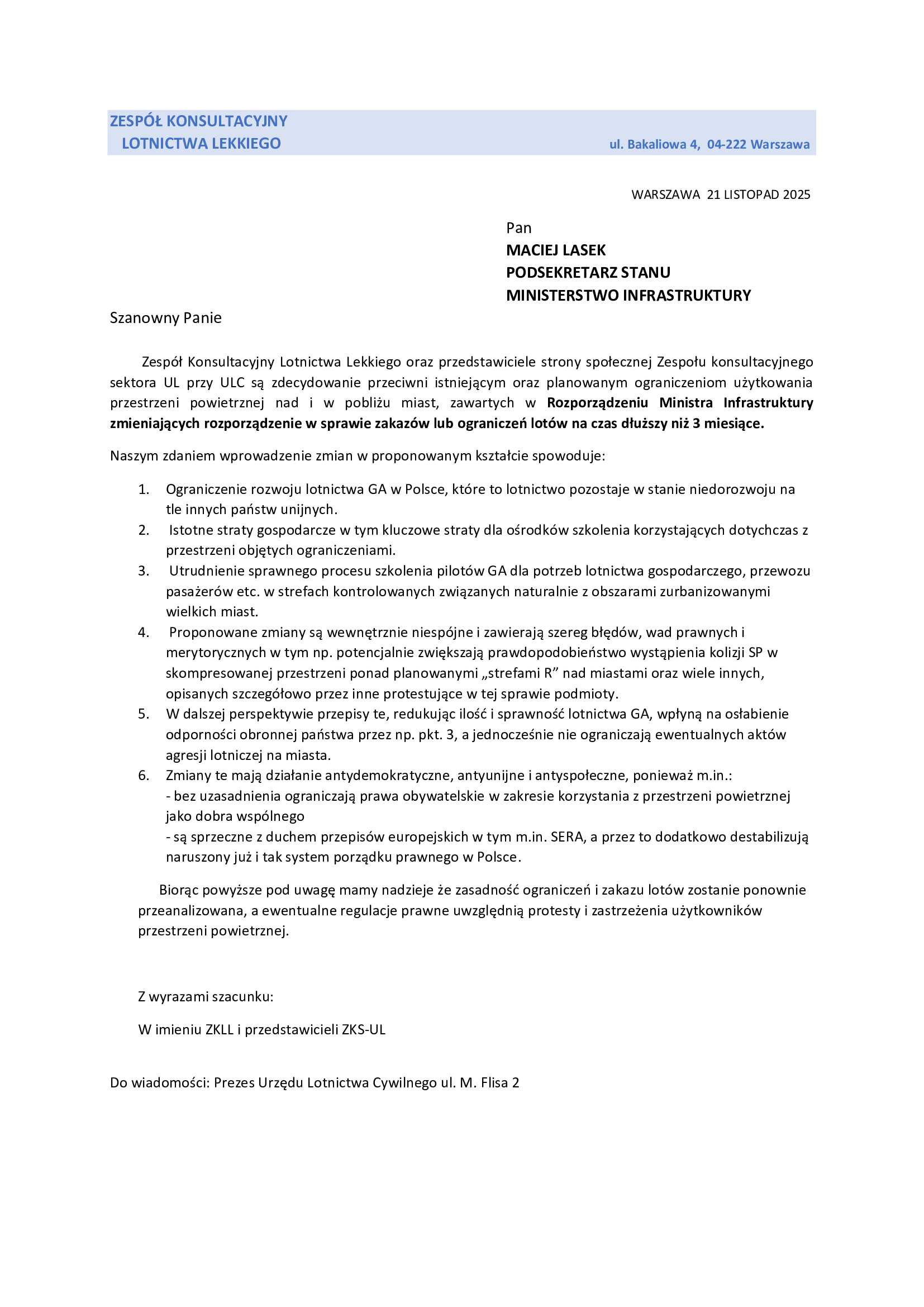 Stanowisko Zespołu Konsultacyjnego Lotnictwa Lekkiego w sprawie istniejących oraz planowanych ograniczeń użytkowania przestrzeni powietrznej nad i w pobliżu miast