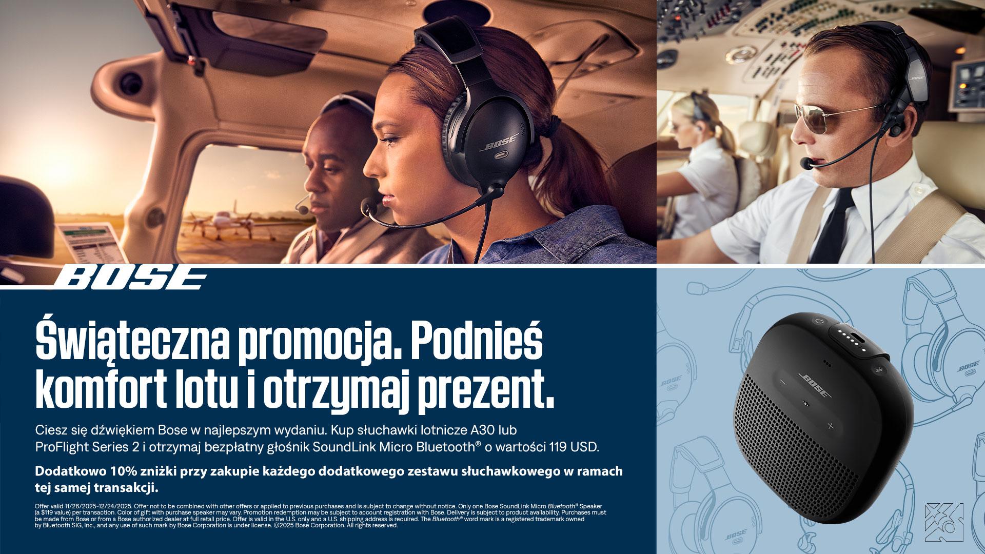 Zasady udziału w promocji są proste. Każdy kto zakupi słuchawki Bose A30 lub Bose ProFlight Series II w okresie od 26.11.2025 do 24.12.2025 otrzyma od firmy Bose wspomniany wyżej głośnik.