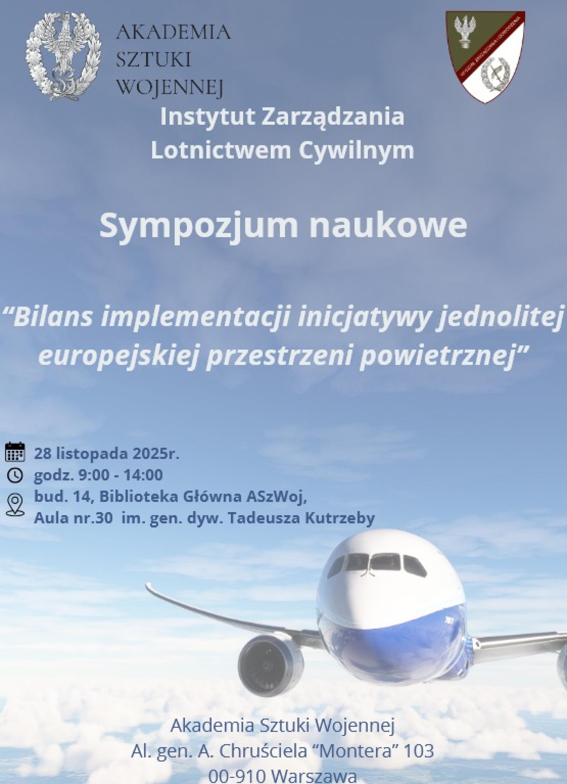 Instytut Zarządzania Lotnictwem Cywilnym Wydziału Zarządzania i Dowodzenia Akademii Sztuki Wojennej zaprasza do udziału w sympozjum naukowym pt. "Bilans implementacji inicjatywy jednolitej europejskiej przestrzeni powietrznej", które odbędzie się 28 listopada 2025 r. w Akademii Sztuki Wojennej, al. gen. A. Chruściela „Montera” 103, Warszawa-Rembertów.