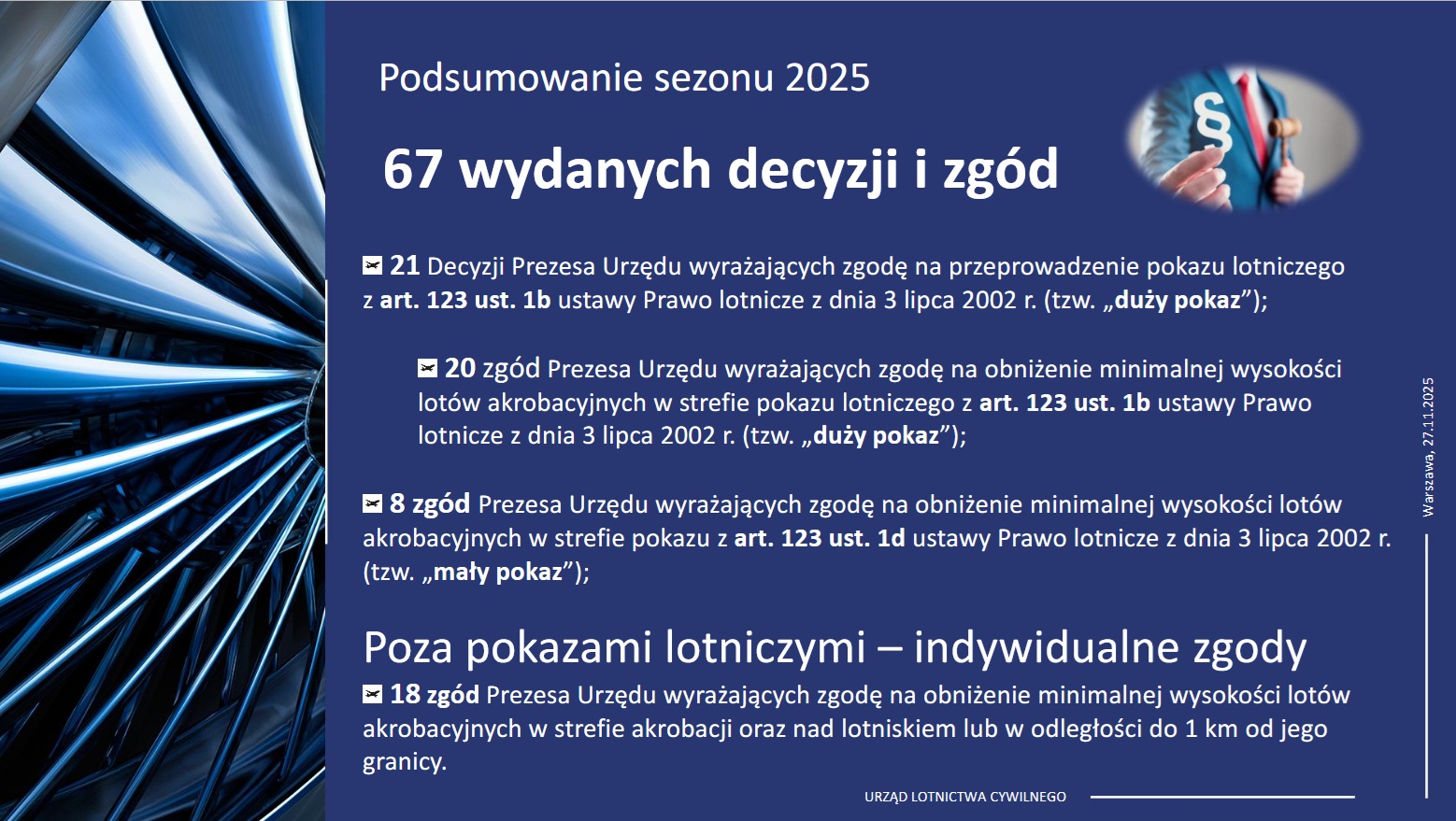 Prezes ULC wydał w sumie 67 decyzji i zgód, w tym 21 dotyczących organizacji dużych pokazów oraz 28 zgód na obniżenie wysokości lotów akrobacyjnych.