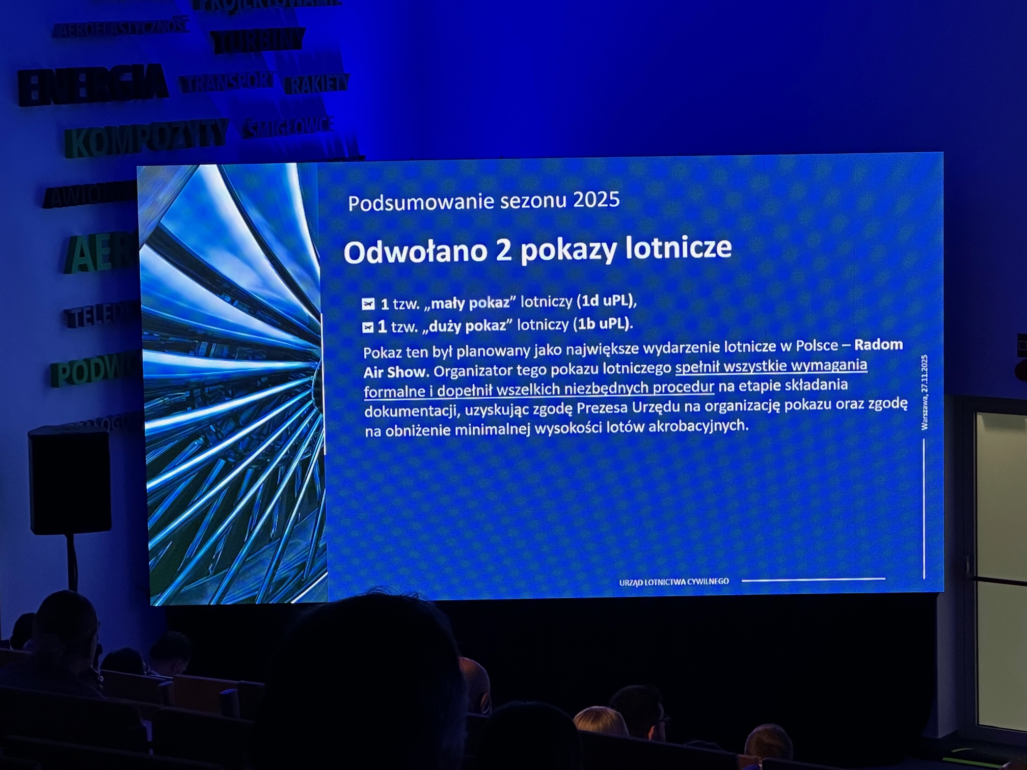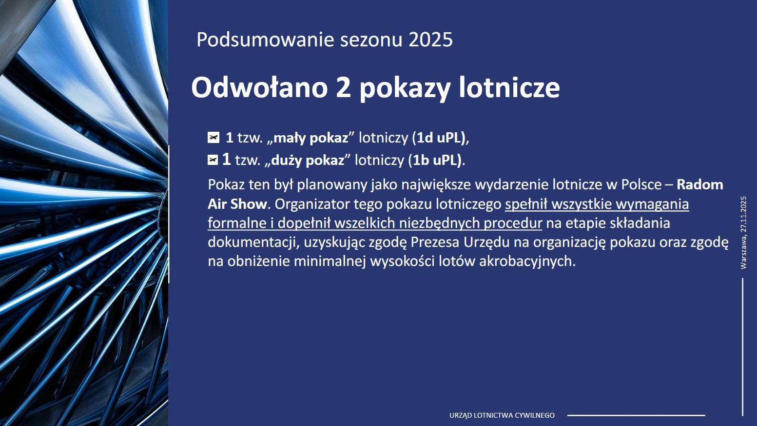 W sezonie 2025 odwołano dwa wydarzenia – jeden mały i jeden "duży pokaz". Wśród nich znalazł się planowany jako największe wydarzenie lotnicze w Polsce Radom Air Show. Mimo że organizatorzy spełnili wszystkie wymagania formalne, pokaz został finalnie odwołany z przyczyn leżących po stronie organizatora.