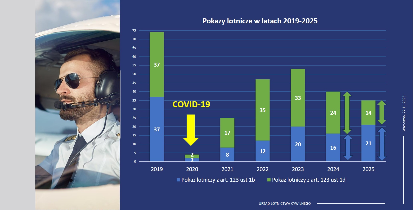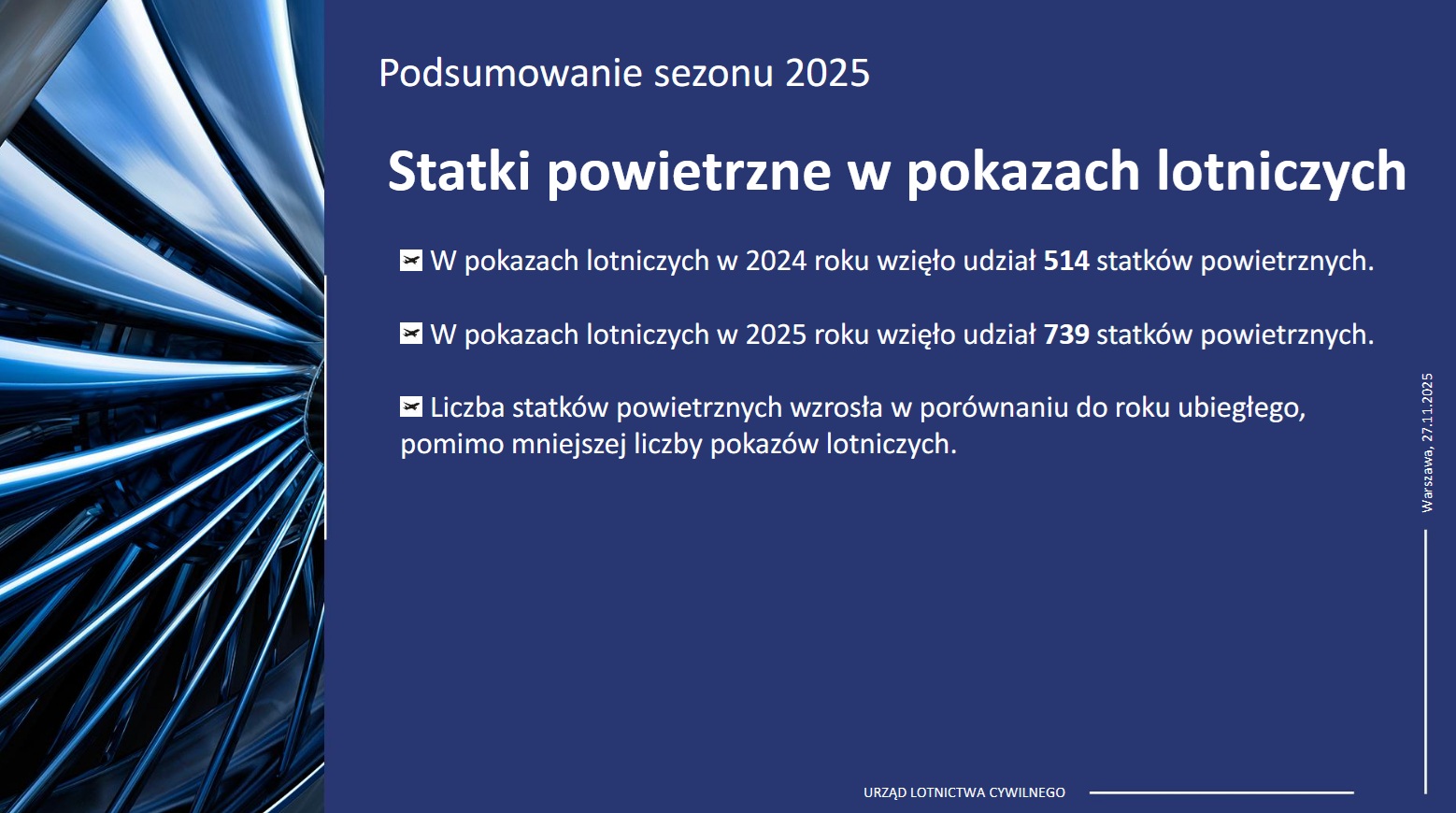 W 2025 r. odbyło się łącznie 35 pokazów lotniczych, podzielonych na tzw. duże (powyżej 1000 widzów) i małe (poniżej 1000 widzów). Mimo mniejszej liczby imprez niż rok wcześniej, liczba uczestniczących statków powietrznych znacząco wzrosła – z 514 w 2024 r. do aż 739 w 2025 r.