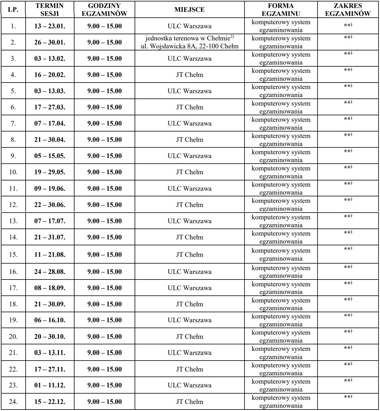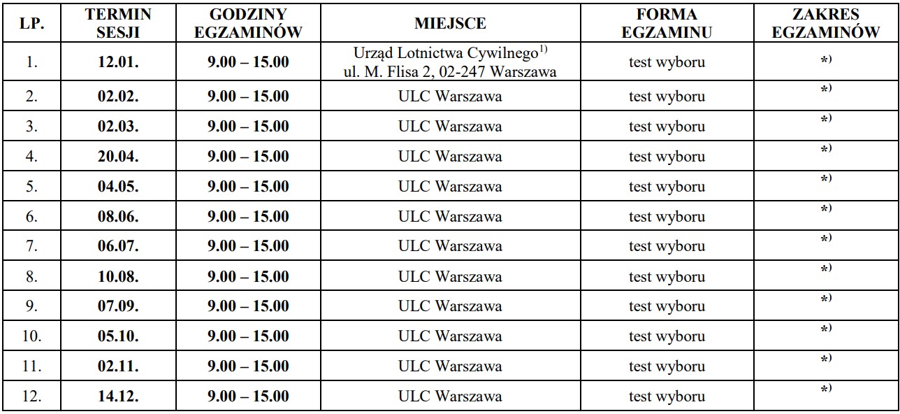 W nadchodzącym roku ULC zaplanował dwanaście sesji egzaminacyjnych z wykorzystaniem papierowych arkuszy egzaminacyjnych oraz dwadzieścia cztery sesje egzaminacyjne z użyciem techniki komputerowej.
