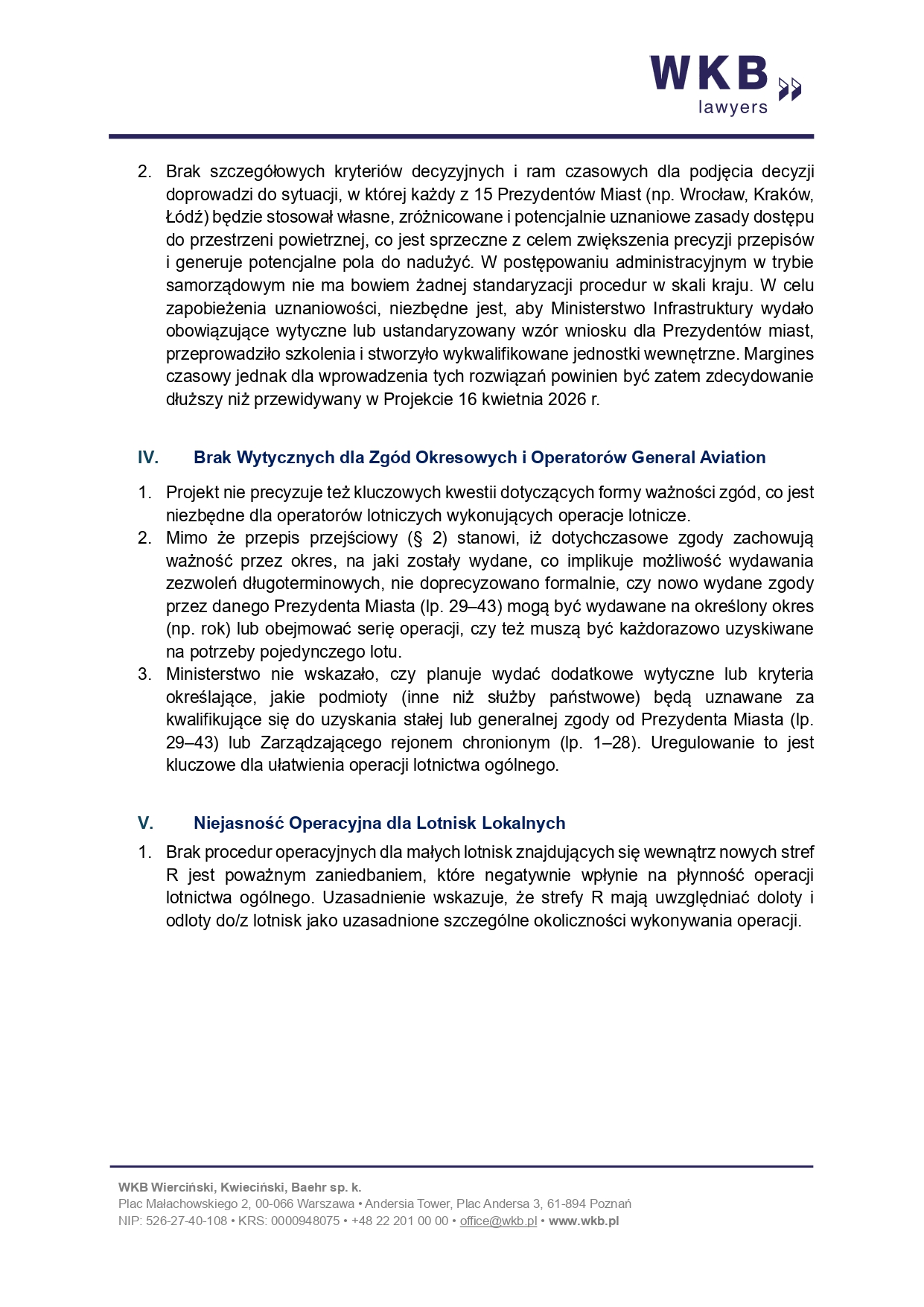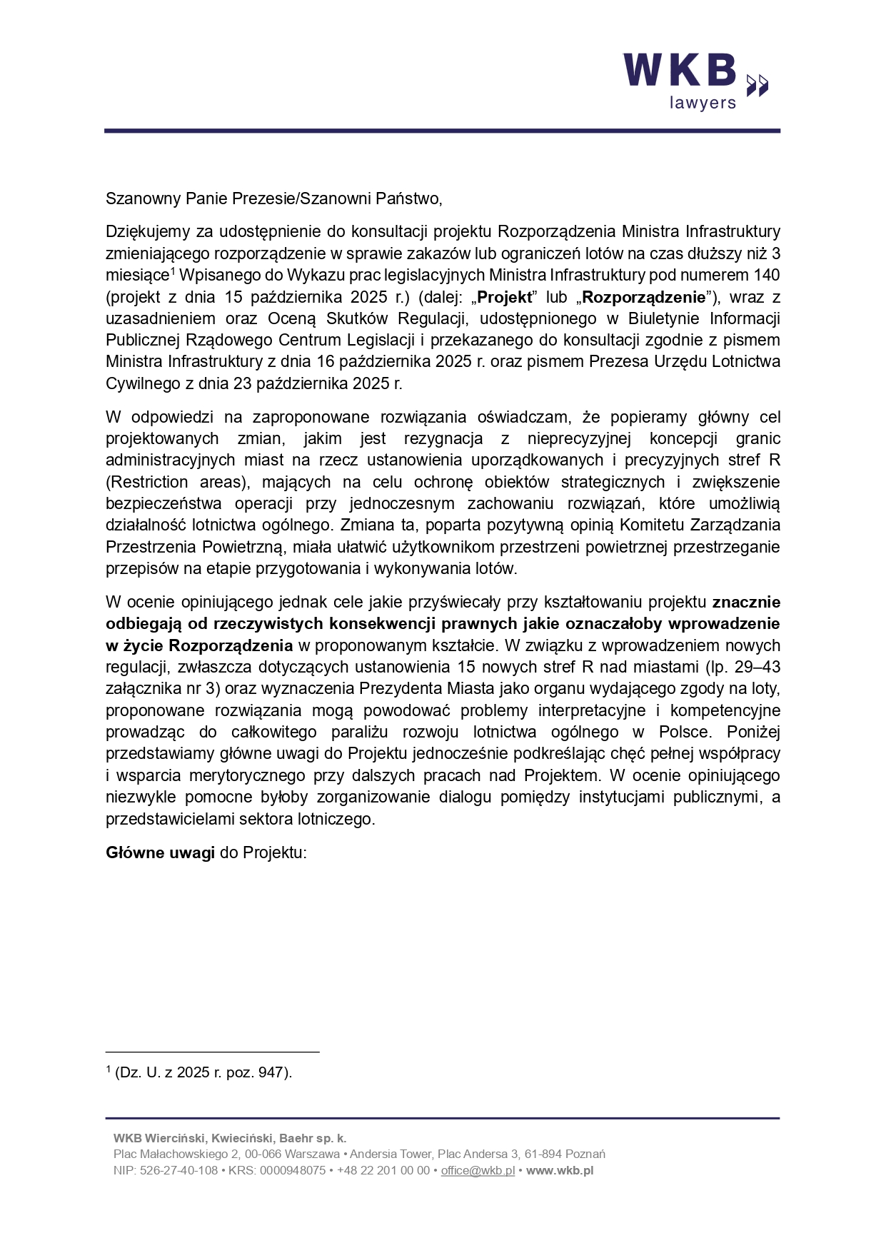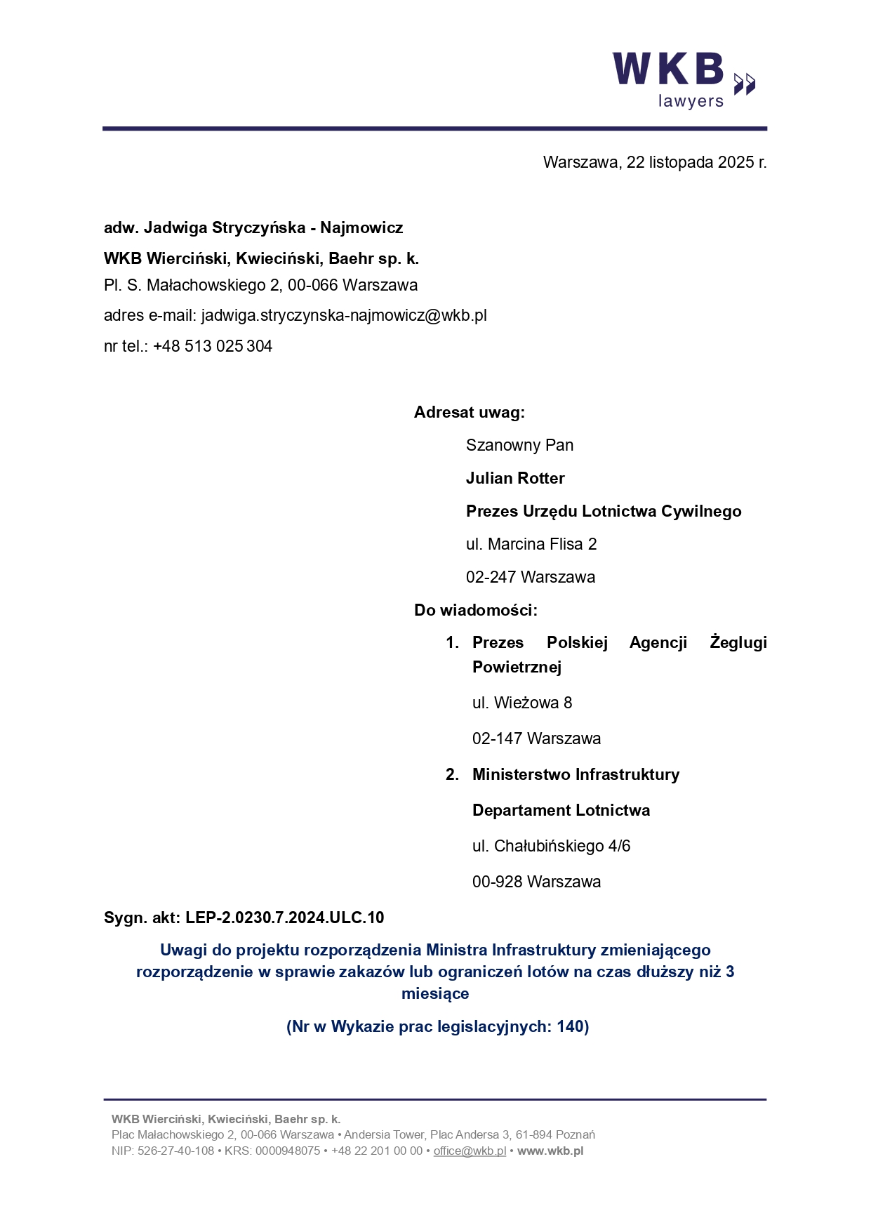 W kwestii projektu rozporządzenia Ministra Infrastruktury zmieniającego rozporządzenie w sprawie zakazów lub ograniczeń lotów na czas dłuższy niż 3 miesiące pojawił się kolejny głos, tym razem wystosowany przez prawników Kancelarii WKB Lawyers.