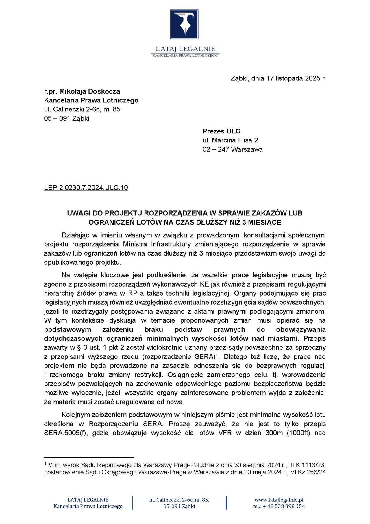 Niniejszym publikujemy uwagi do projektu rozporządzenia w sprawie zakazów lub ograniczeń lotów na czas dłuższy niż 3 miesiące. Pismo zostało wystosowane przez r.pr. Mikołaja Doskocza i zaadresowane do Prezesa Urzędu Lotnictwa Cywilnego.