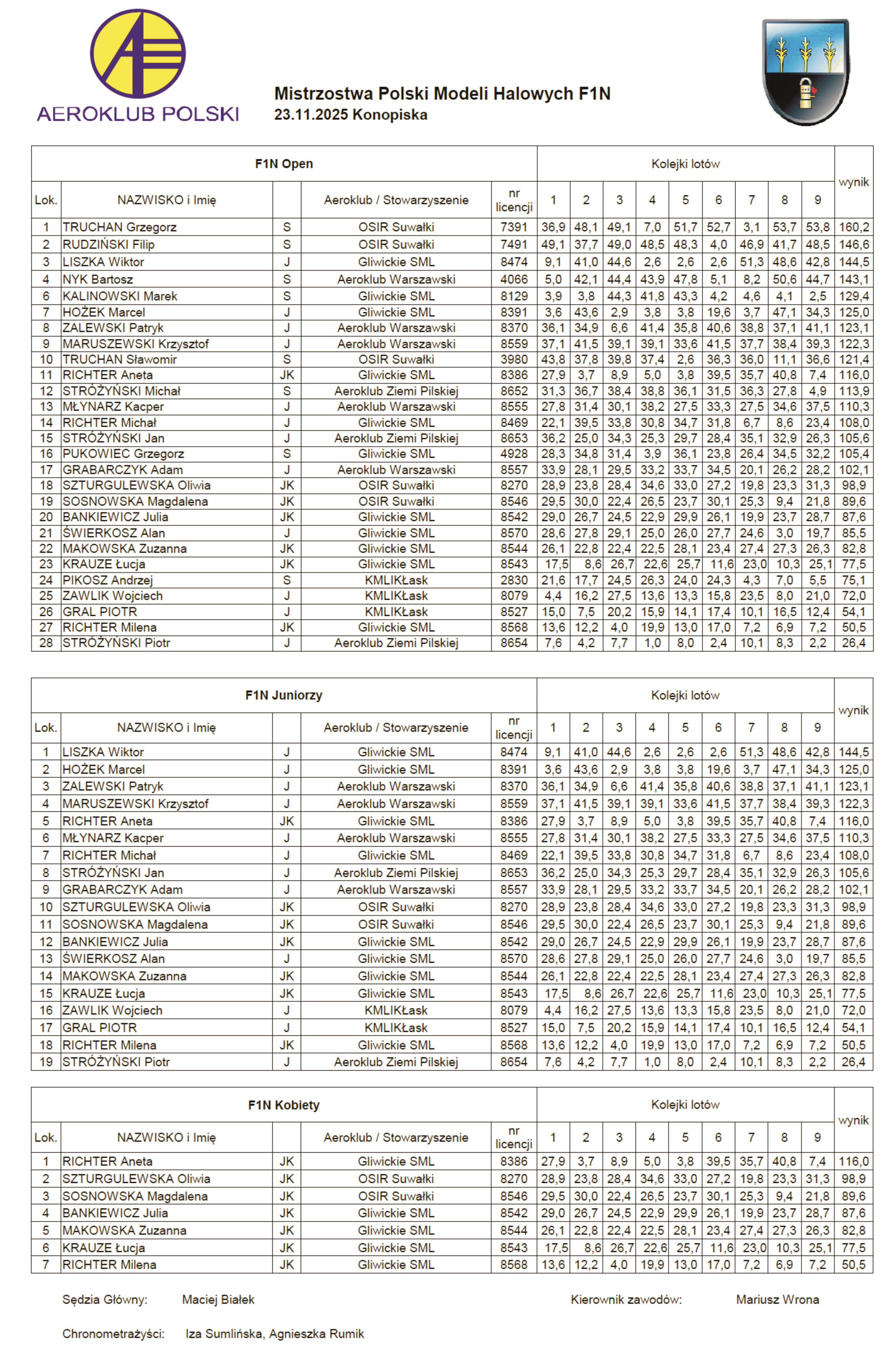 Wyniki Mistrzostw Polski Modeli Halowych F1N – Konopiska 2025