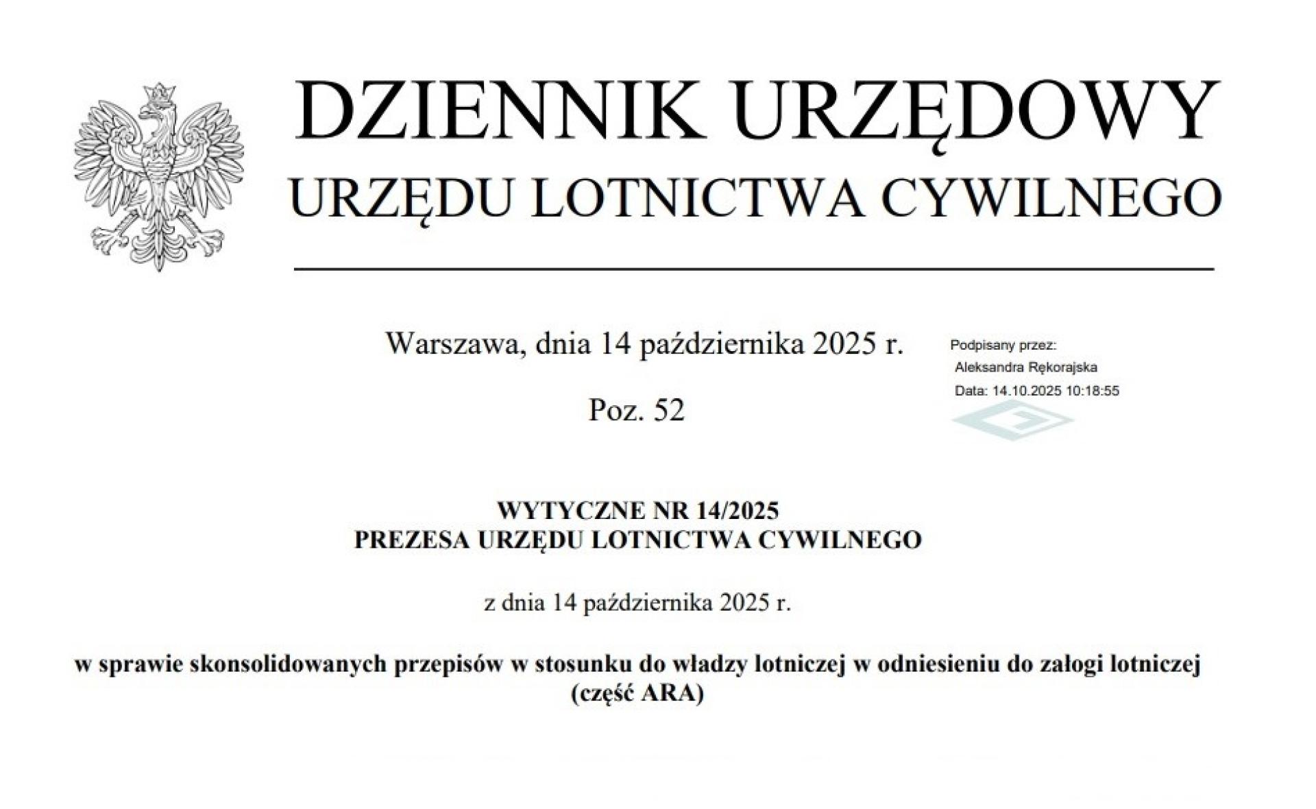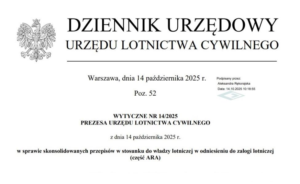 14 października 2025 r., w Dzienniku Urzędowym Urzędu Lotnictwa Cywilnego pod pozycją 52 ukazały się Wytyczne nr 14/2025 Prezesa ULC z dnia 14 października 2025 r. w sprawie skonsolidowanych przepisów w stosunku do władzy lotniczej w odniesieniu do załogi lotniczej (część ARA).