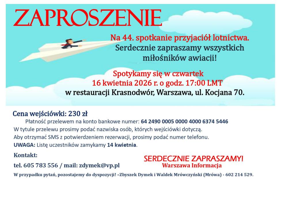 Zespół Służby Informacji Powietrznej (FIS) serdecznie zaprasza na kolejne spotkanie przyjaciół lotnictwa. Odbędzie się ono w czwartek 16 kwietnia 2026 r. o godz. 17.00 LMT w restauracji Krasnodwór przy ul. Kocjana 70 w Warszawie. Strona internetowa lokalu www.krasnodwor.pl