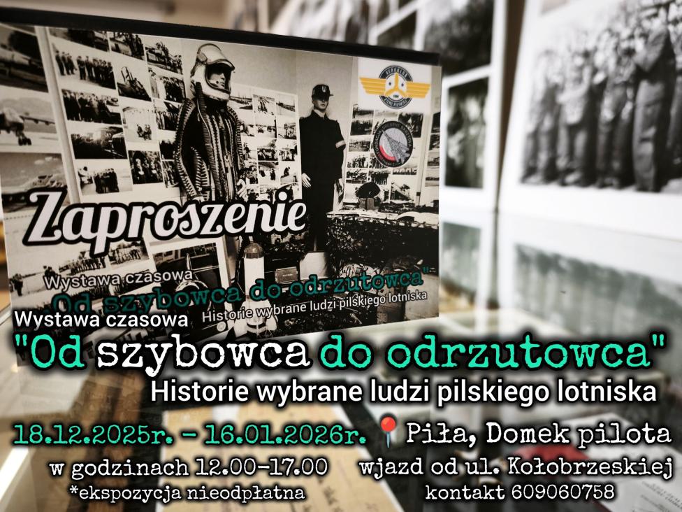 Fundacja Srebrne Skrzydła oraz Aeroklub Ziemi Pilskiej zapraszają na wystawę czasową "Od szybowca do odrzutowca - historie wybrane ludzi pilskiego lotniska", którą będzie można obejrzeć w dniach od 18 grudnia 2025 r. do 16 stycznia 2026 r. (z wyjątkiem 24-26 grudnia 2025 r.), w godzinach 12:00–17:00 w Pile, w Domku pilota na EPPI (wjazd od ul. Kołobrzeskiej, przez plac manewrowy i bramę przy nasypie ziemnym prosto na parking przy domku pilota).