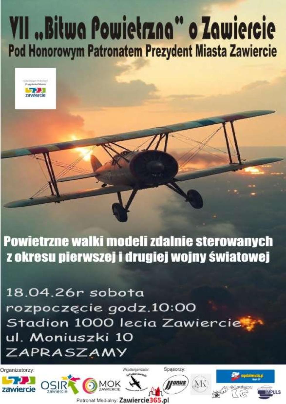 Zapraszamy modelarzy do udziału w zawodach Air Combat ESA – VII Bitwie Powietrznej o Zawiercie. Zawody, zaliczane do Pucharu Polski ESA, odbędą się 18.04.2026 r. na stadionie 1000-lecia Państwa Polskiego w Zawierciu przy ul. Moniuszki 10. Początek o godzinie 10:00.