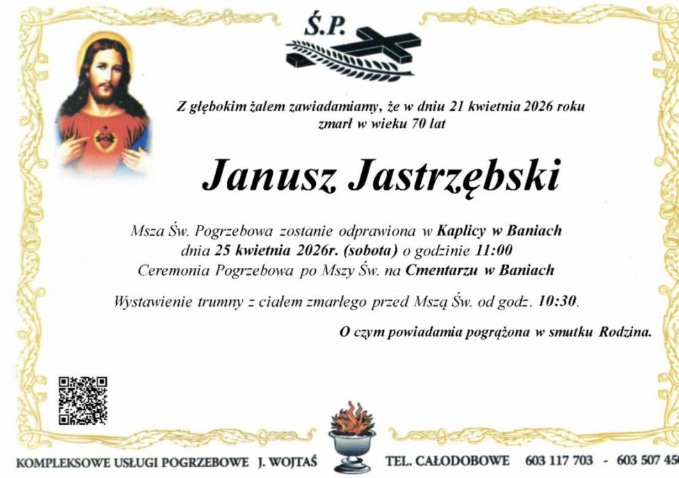 Msza Św. Pogrzebowa zostanie odprawiona 25 kwietnia 2026 r. (sobota) o godzinie 11:00 w Kaplicy w Baniach, ul. Kunowska. Ceremonia Pogrzebowa po Mszy Św. na Cmentarzu w Baniach.
